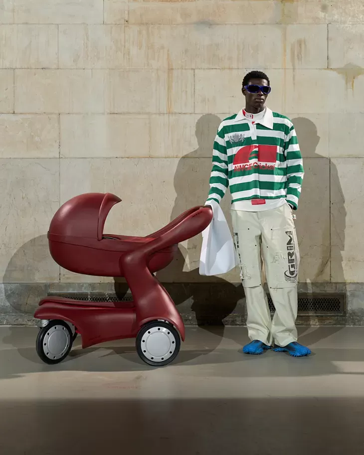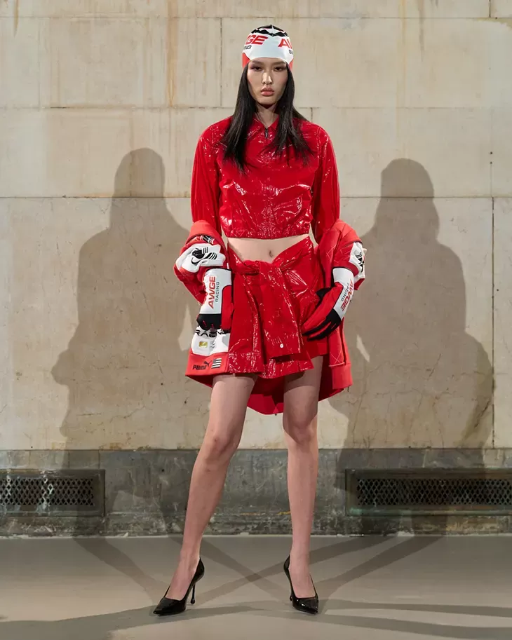 The presentation introduced new pieces alongside a preview of his collaboration with PUMA, spotlighting the Mostro Lenticular, the Mostro 3.D Mule and the highly anticipated A$AP Rocky x PUMA Straycat, scheduled for autumn release. Accessories such as the Oil Can Bag and the Racing Hoodie reinforced the collection’s graphic energy and motorsport references.