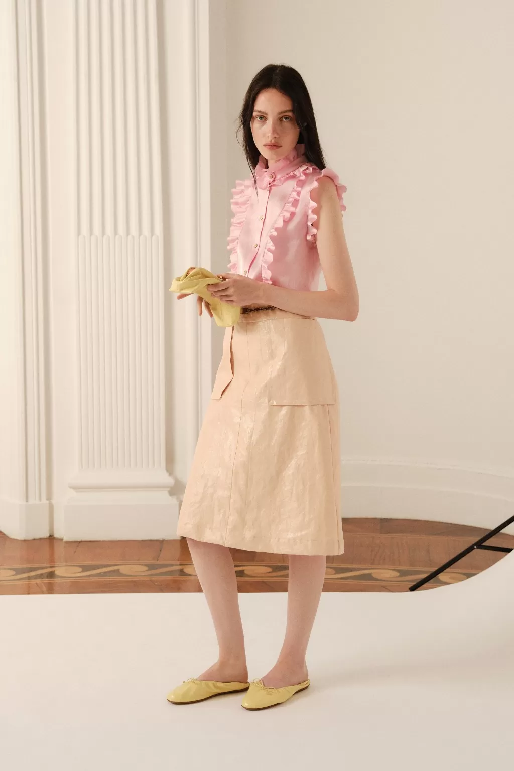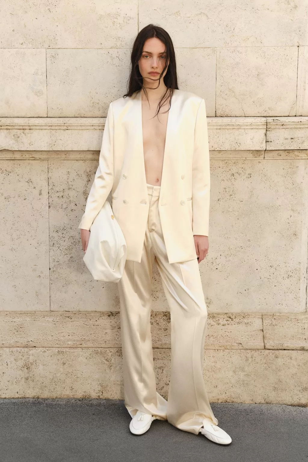 What’s the secret to its success? Fabrics like triple-layer organza replace traditional chiffon, bringing to life silhouettes that are both structured and weightless. Flowing dresses, lightweight trench coats, and cabin-inspired jackets blend seamlessly with full skirts and graphic suits, all in a colour palette ranging from ivory to black, with dusty pinks and burnt oranges in between.