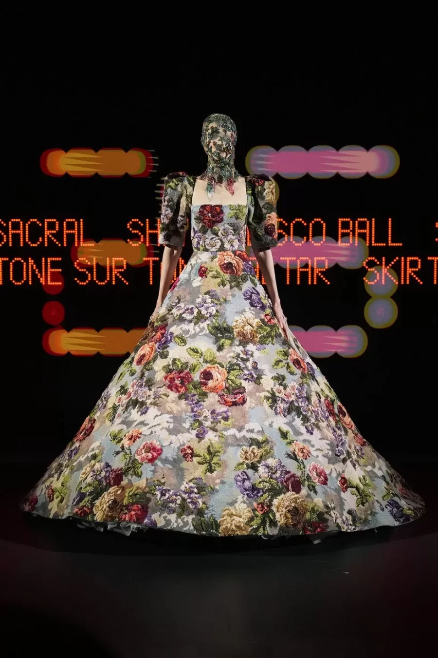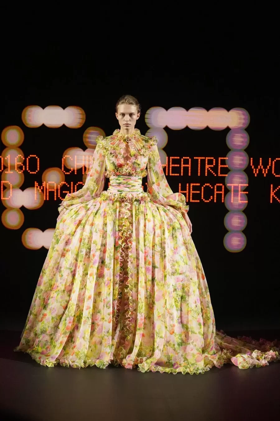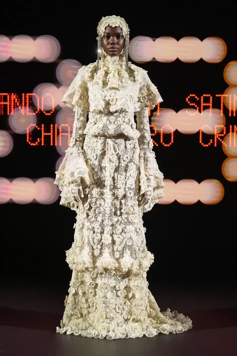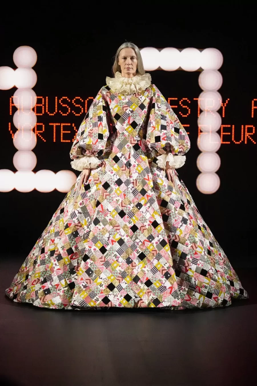 The collection fused historical references with theatrical elements, showcasing voluminous skirts inspired by the 18th century, ’70s-style ruffles, and whimsical details such as a harlequin-patterned gown. This maximalist and eclectic approach marked a departure from the minimalist romanticism of his predecessor, Pierpaolo Piccioli.