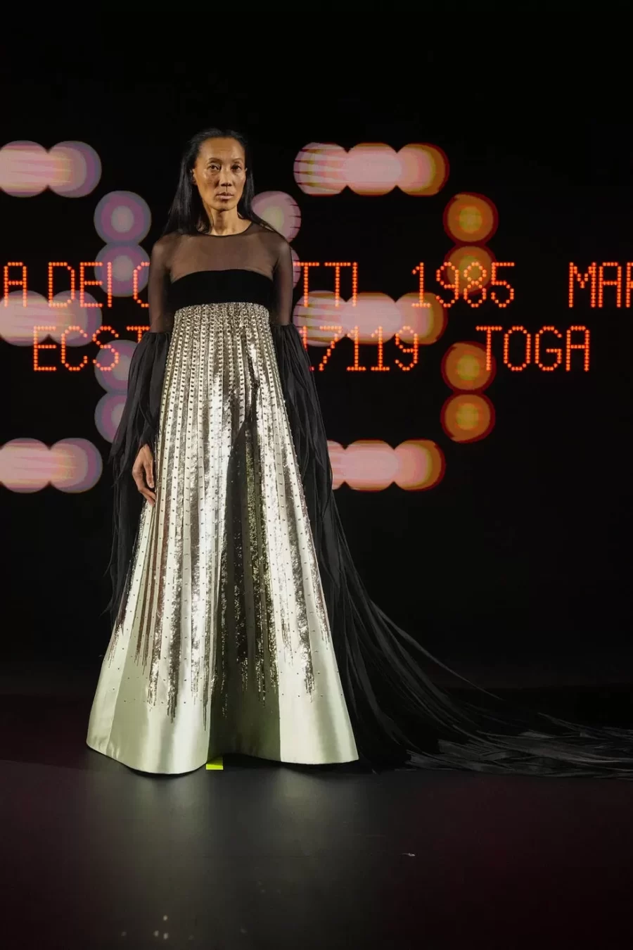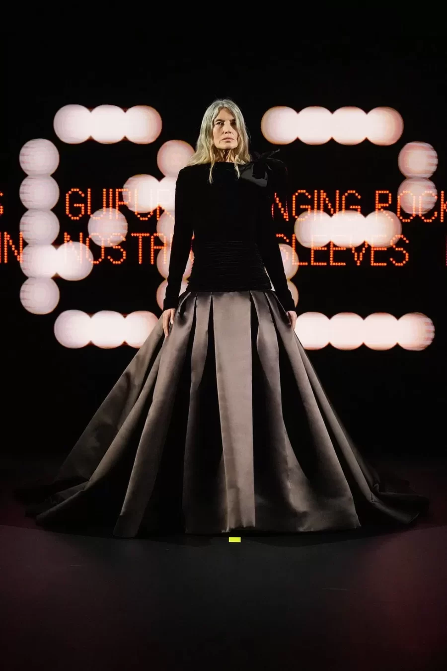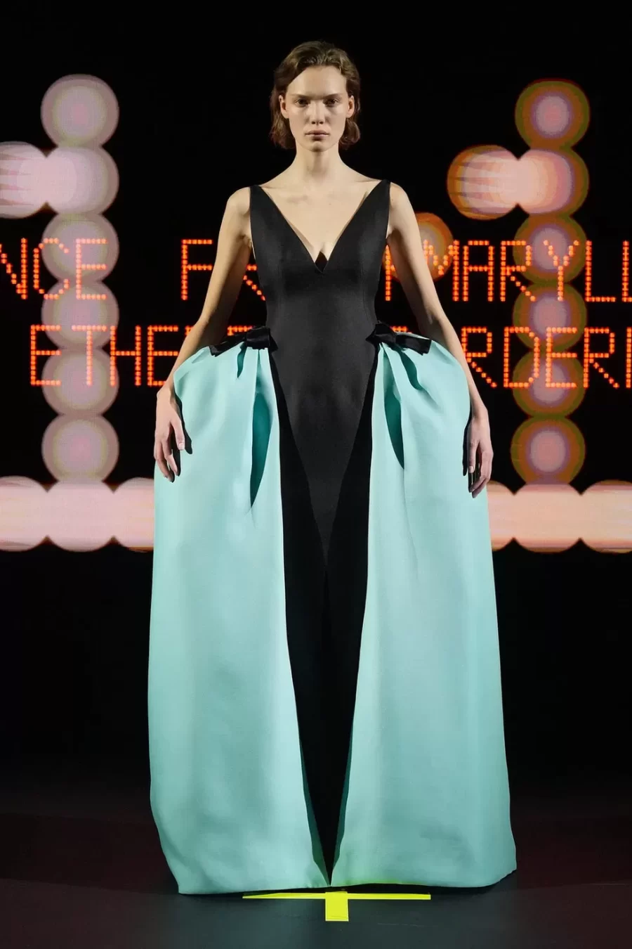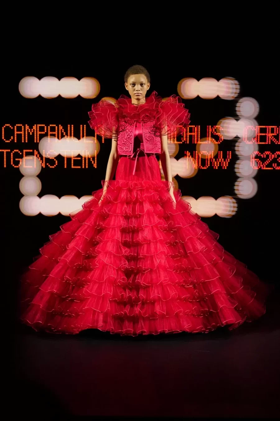 The collection fused historical references with theatrical elements, showcasing voluminous skirts inspired by the 18th century, ’70s-style ruffles, and whimsical details such as a harlequin-patterned gown. This maximalist and eclectic approach marked a departure from the minimalist romanticism of his predecessor, Pierpaolo Piccioli.