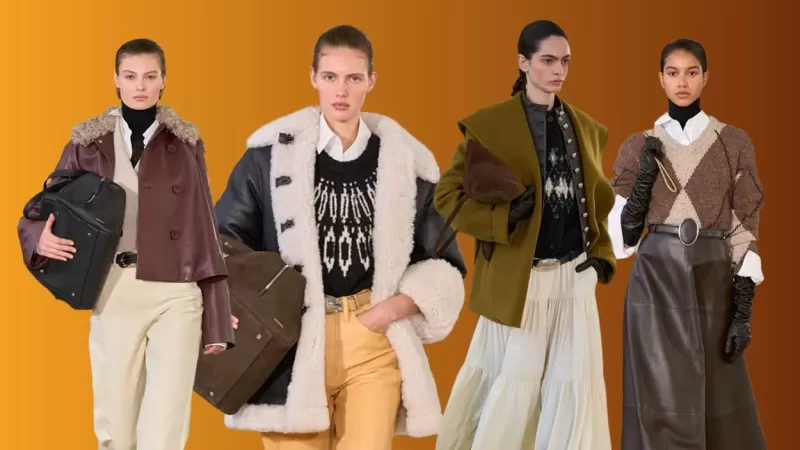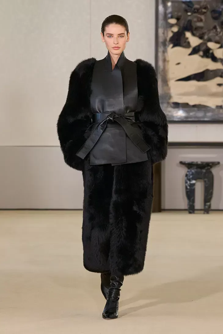 The collection balances strength and sensuality. Outerwear with matador-inspired shoulders commands attention, while fringed dresses and shirts create movement with every step. A seemingly restrained turtleneck reveals a calf-length cape at the back, proving that drama can emerge through control.