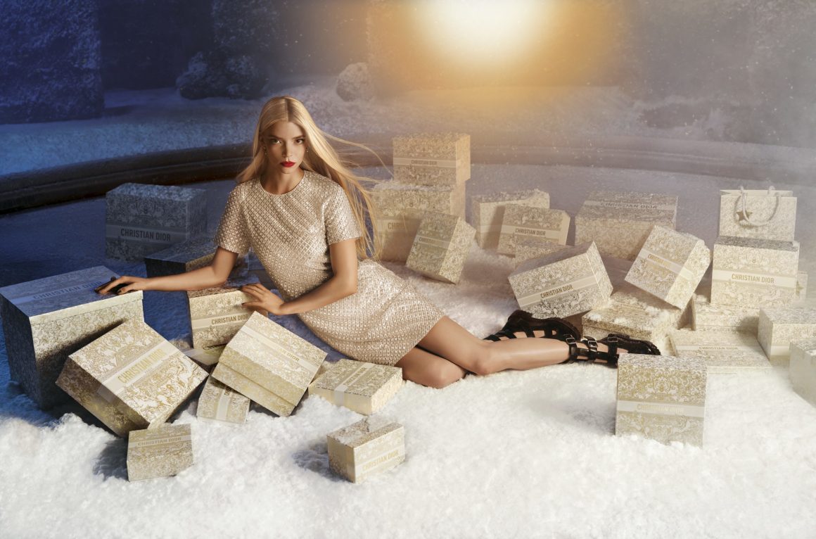 Revealing another facet of festive glamour, Anya presents a dazzling picture in a radiant golden ensemble that embodies the essence of the holiday spirit. This resplendent dress, surrounded by shimmering gifts, becomes the centerpiece, encapsulating Dior’s vision of holiday magnificence.