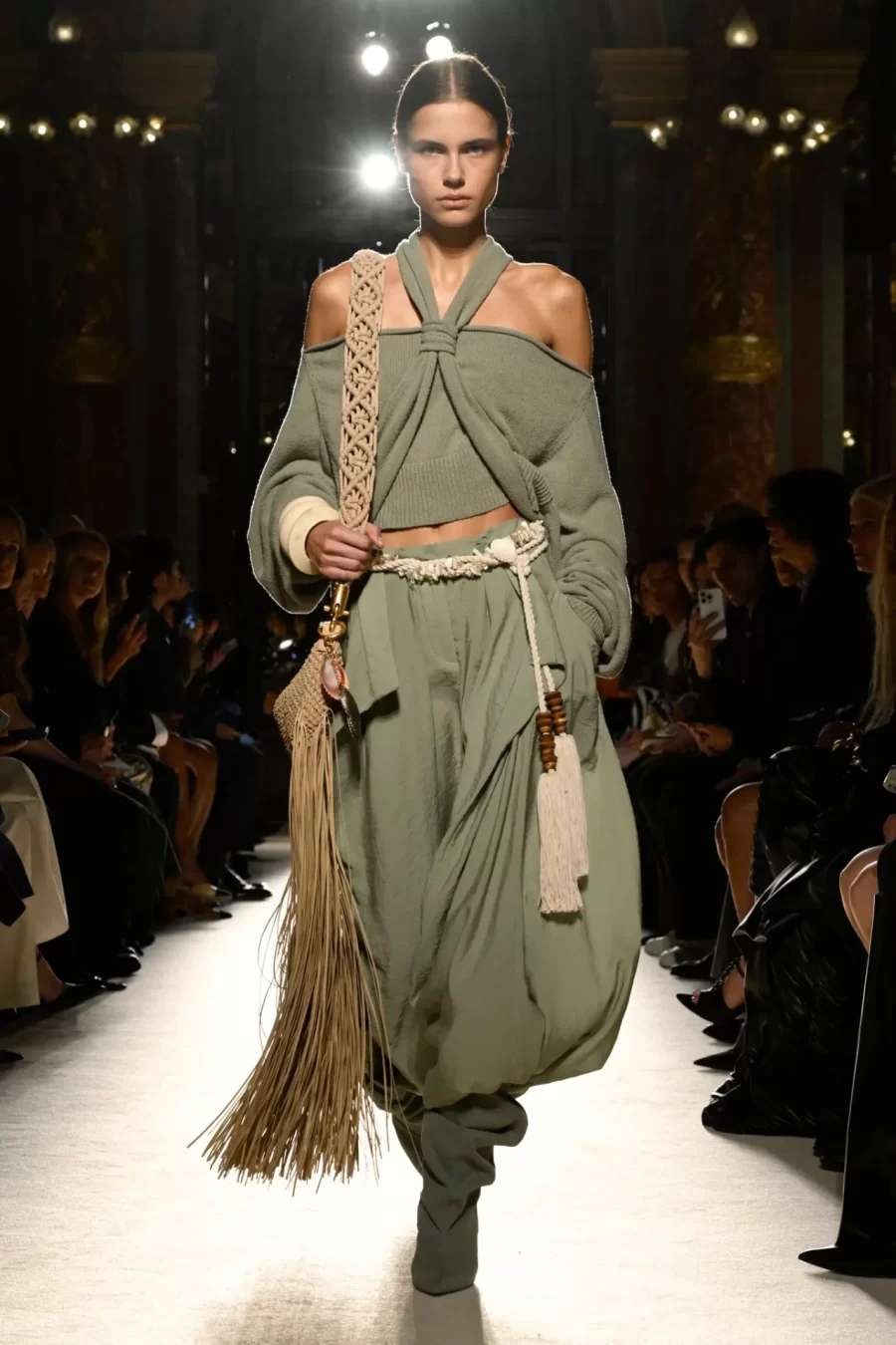 Dresses resembling towels wrapped after a swim, seashell tops and macramé pieces with endless fringes defined a lighter, more accessible proposal, still theatrical in spirit. Wide sarouel trousers, open-weave sweaters sliding off the shoulders, strong leather jackets and draped tops evoked a summer without rules.