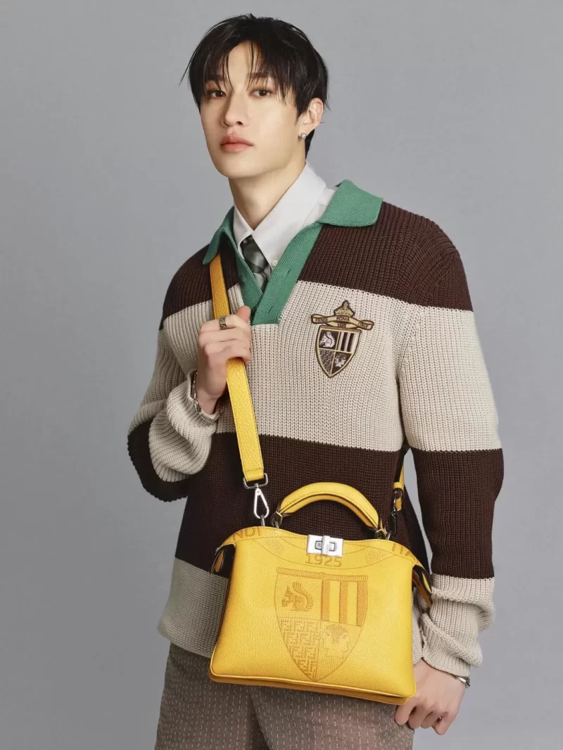 In his first campaign as an ambassador, Bang Chan showcases a look from the Spring/Summer 2025 men’s collection. The outfit combines elegance and freshness, featuring a brown and beige striped sweater, jacquard shorts, and signature accessories like the Peekaboo and Baguette Double bags.