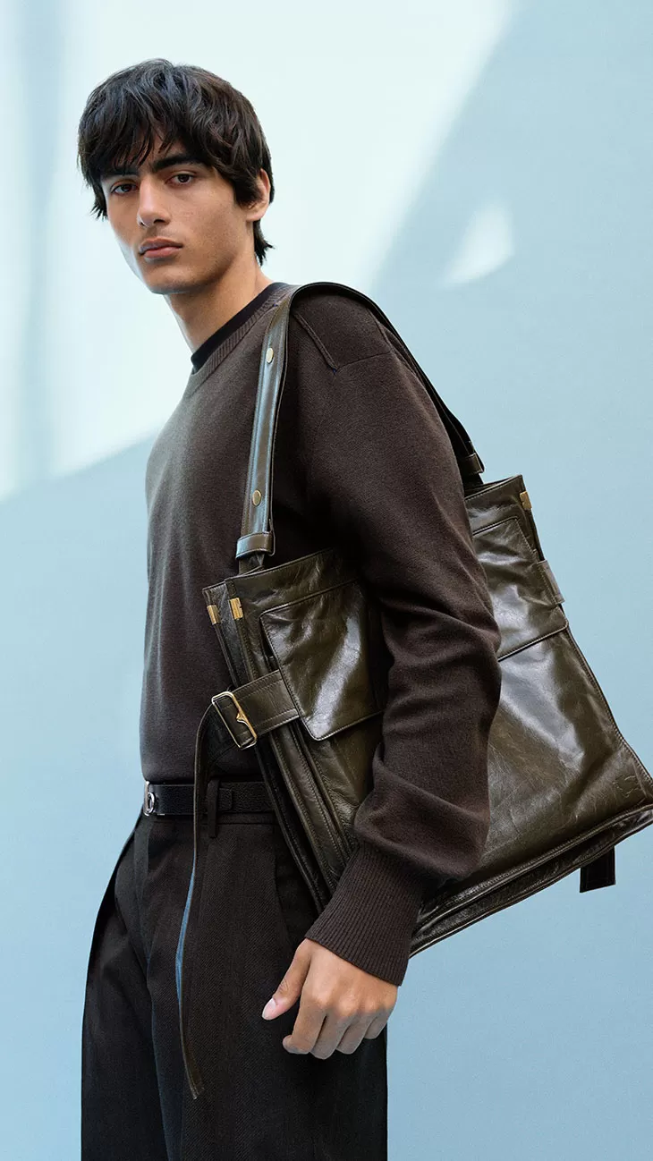 Leather bags accompany most of the looks, available in messenger, shoulder, and clutch styles. A crossbody bag with a green pattern and a spacious shoulder bag provide functionality and fashion to the men’s looks.