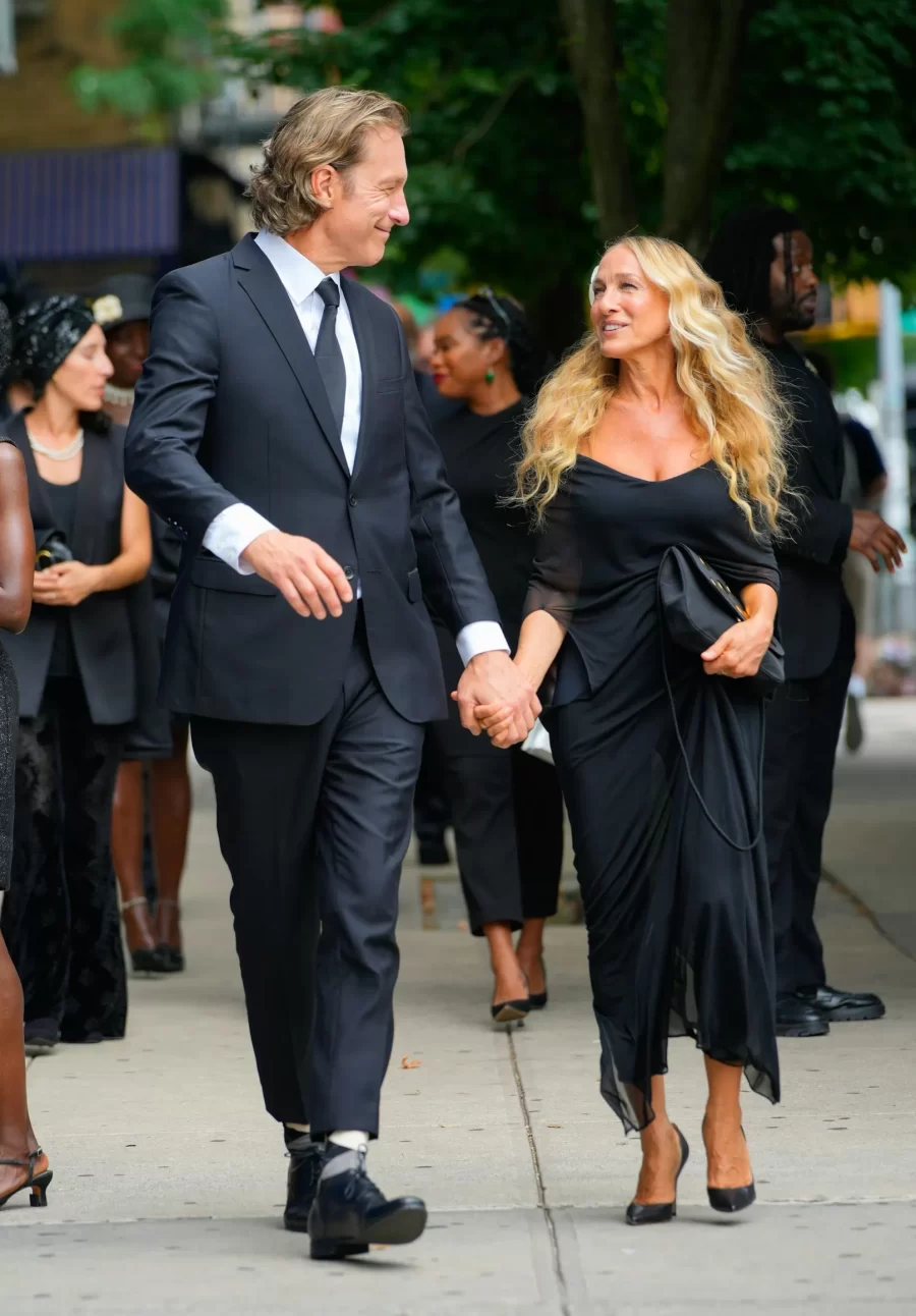 Carrie Bradshaw‘s haunted doll style has taken a much darker turn. While filming the third season of ‘And Just Like That…,’ Sarah Jessica Parker was seen attending what appears to be a funeral, dressed in leggings. Parker wore a plunging black dress with goddess-worthy draping. The neckline was adorned with a sheer fabric cape over the shoulders, and the dress transformed into a maxi skirt that reached her ankles. She paired her elegant dress with a black handbag with gold polka dots and classic stilettos. This understated look is fitting for a funeral scene, although Bradshaw added a unique twist by wearing fitted leggings underneath.
