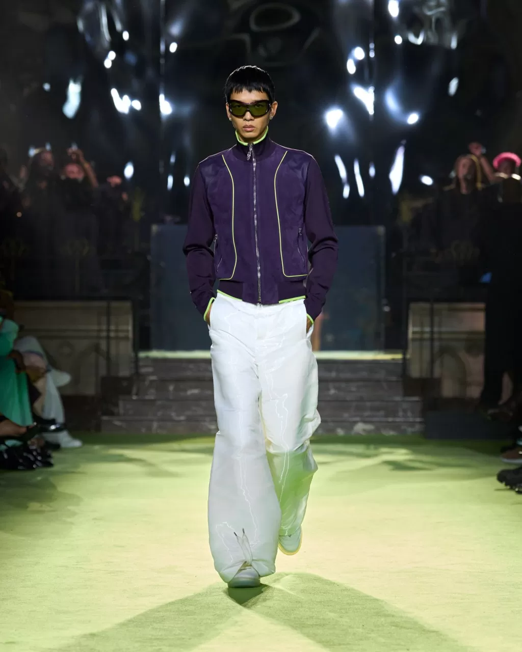 On the runway, Casablanca presented looks reflecting the diversity of those who live on the dance floor: acid-yellow cargo trousers, satin jackets in tangerine tones, skirts and dresses covered in hand-dyed sequins in blue, green and pink. Crochet silver flares, wet-effect miniskirts and soft pink sweatshirts blurred the lines between sport, street and playfulness.