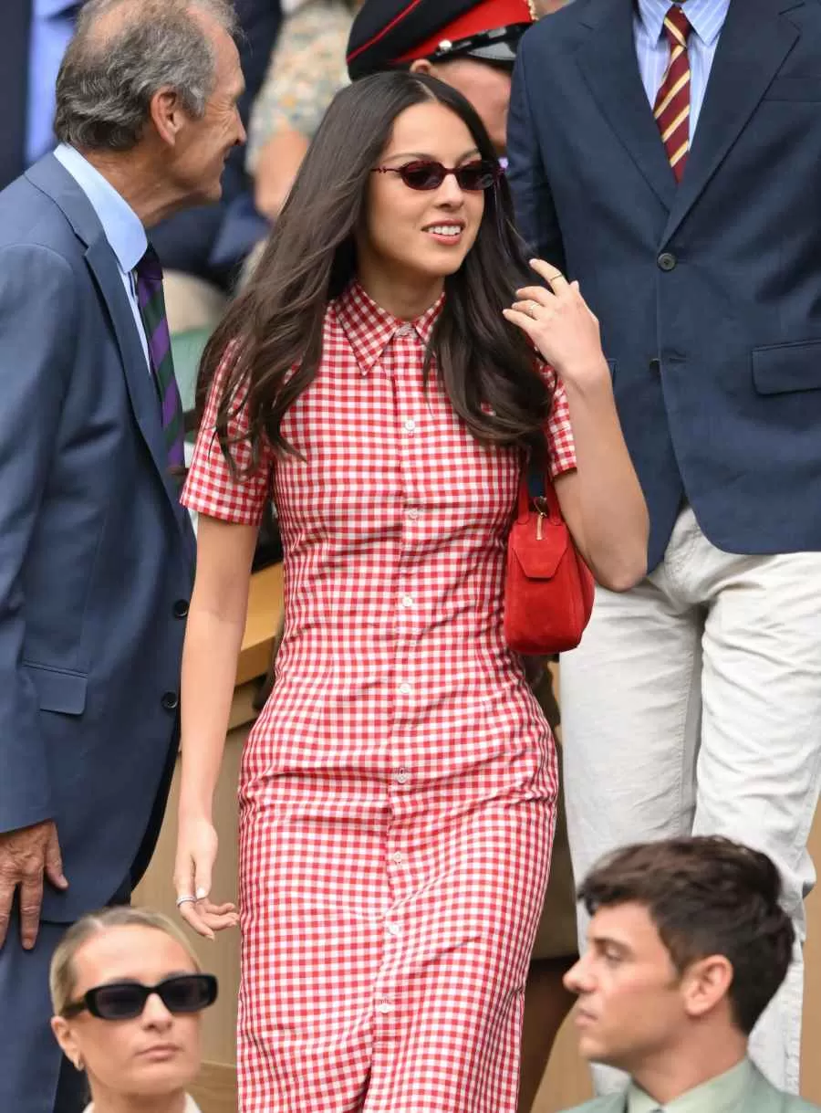 Olivia Rodrigo brought vintage charm in a gingham Ralph Lauren dress and a red suede Khaite shoulder bag.