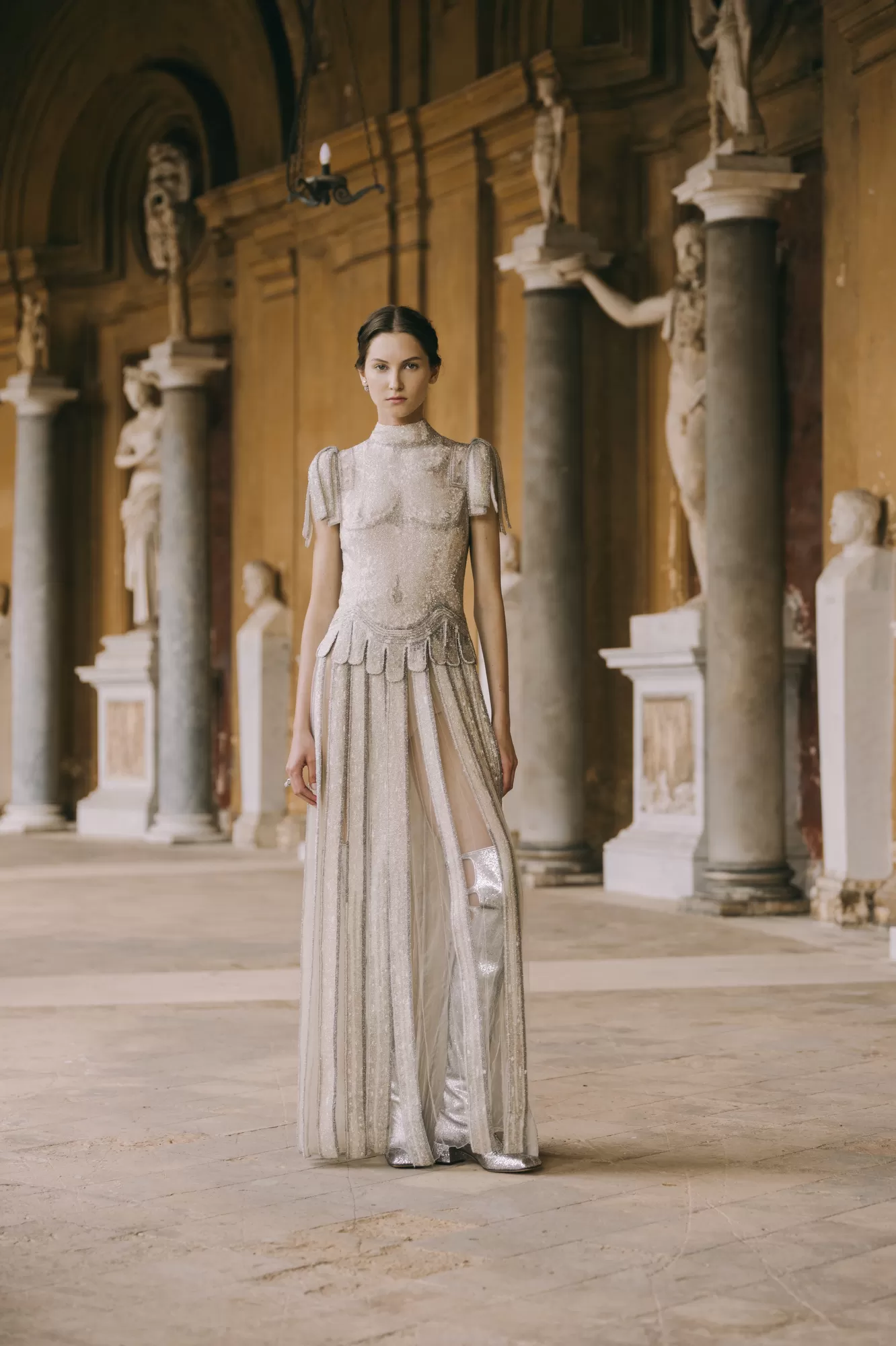 Inspired by heroines of the silver screen and the grandeur of the Roman Empire, the collection featured flowing dresses, delicate lace, dark velvets and majestic capes embroidered with gold. Each garment evoked the aura of a Renaissance princess or a Visconti muse.