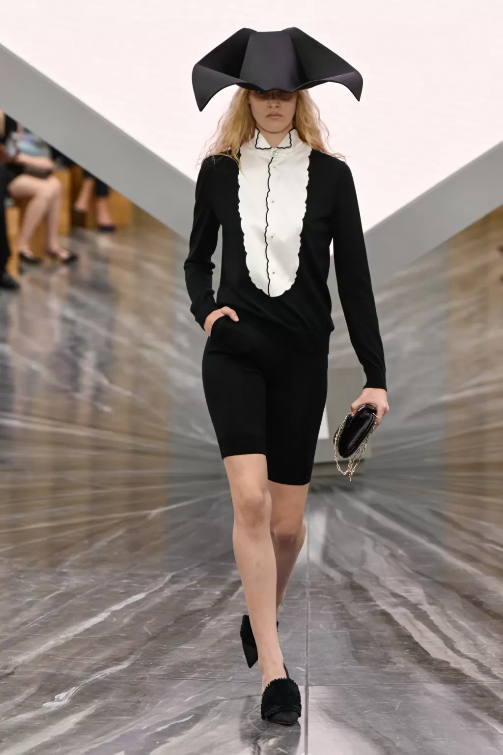 In the front row, Delphine Arnault, chief executive officer of Christian Dior Couture, sat alongside Brigitte Macron and Johnny Depp, the long-time ambassador of the fragrance Sauvage. Towering over the grey marble runway, an inverted pyramid served as a screen for a short film preceding the show, echoing the eerie tension of classic horror cinema.
