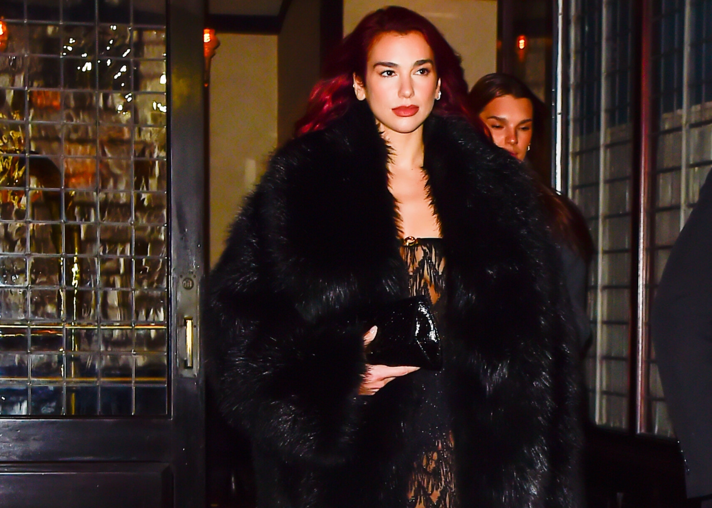 The singer adorned a long, sheer dress adorned with chevron-shaped beads, barely concealing a pair of high-waisted black panties, with an Entire Studios floor-length black faux fur coat draped over her shoulders. In terms of accessories, she sported knee-high pointed-toe boots, carried an elegant black patent leather handbag, and opted for a single earring. It remains to be seen whether Dua misplaced the other earring or if she is simply setting a new trend for 2024.