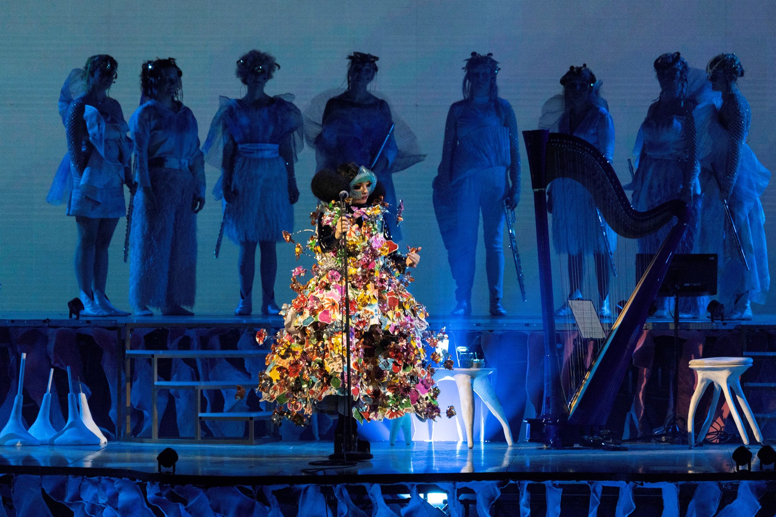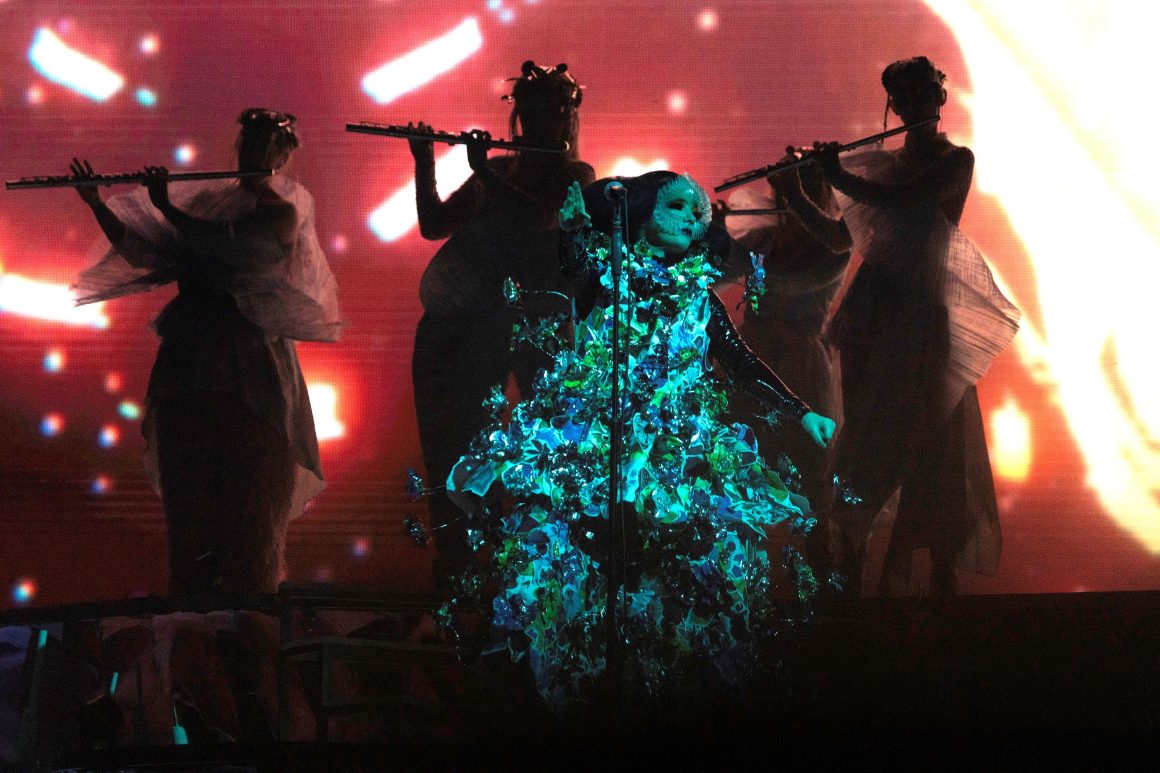 Björk dazzles on her ‘Cornucopia’ tour with an exclusive MARNI ensemble, seamlessly blending avant-garde fashion and stage artistry in Nantes.