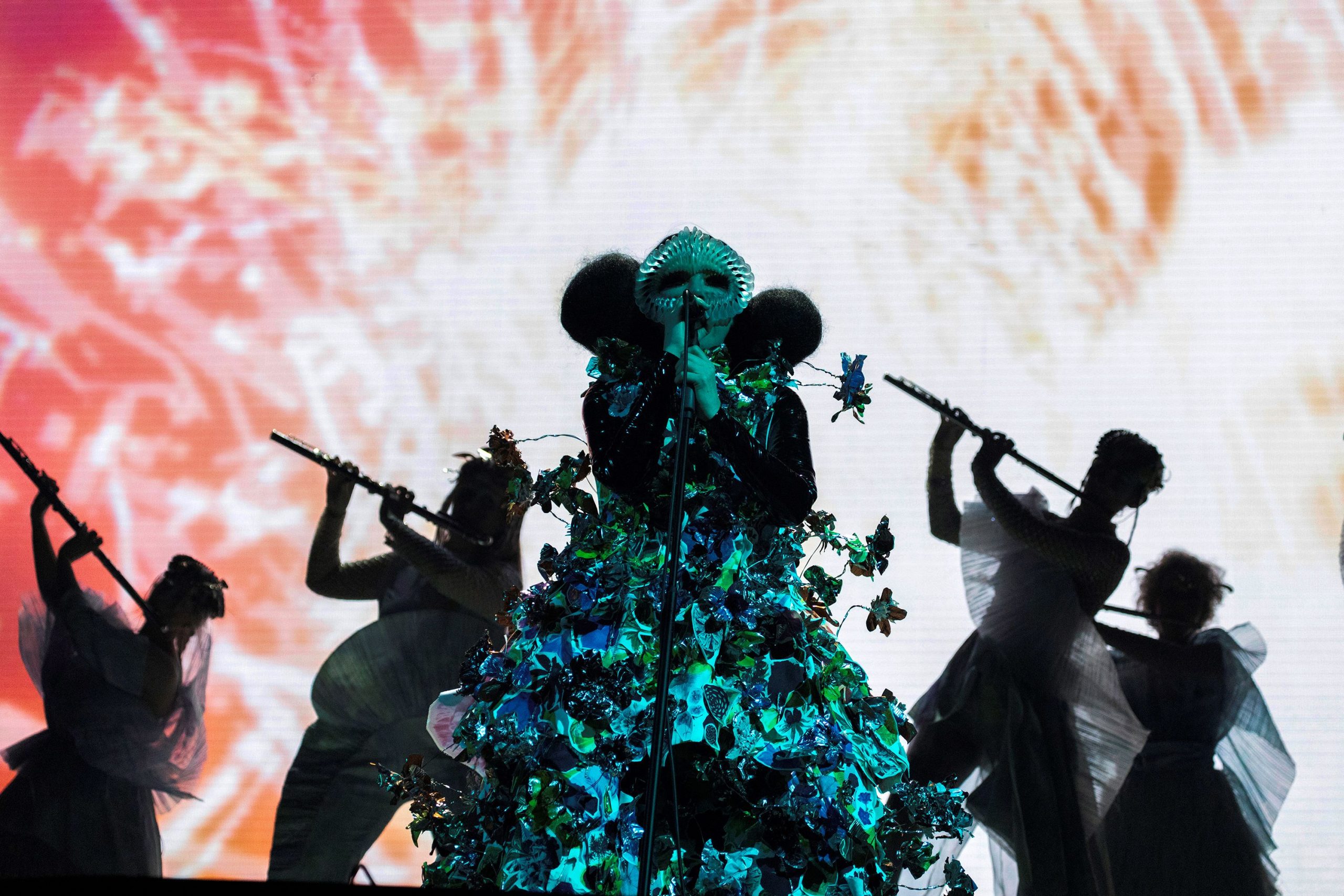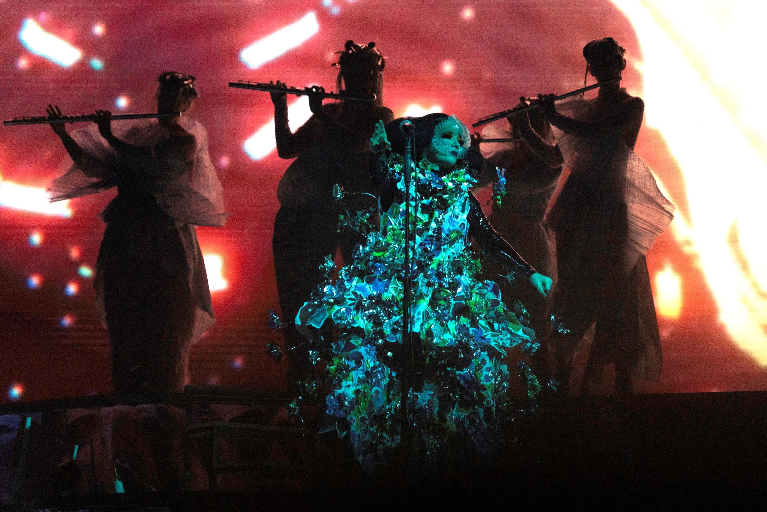 The visible seams, distinctive of MARNI, highlighted the brand’s characteristic repair effect, showcasing the meticulous handiwork invested in this unique ensemble. The captivating fusion of art and fashion brought an ethereal quality to the performance, underscoring Björk’s affinity for pushing boundaries not only in music but also in her sartorial choices. This MARNI masterpiece adds another layer of intrigue to the multifaceted experience that is ‘Cornucopia’.