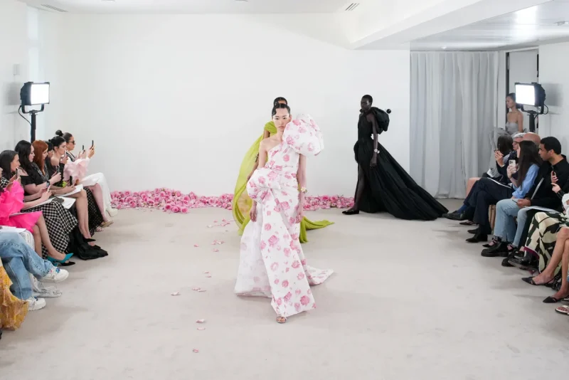 The brand’s voluminous silhouettes and wide skirts were showcased in a palette of black, white, and baby pink on the rose-filled runway that Giambattista Valli brought to us for his new Haute Couture collection.