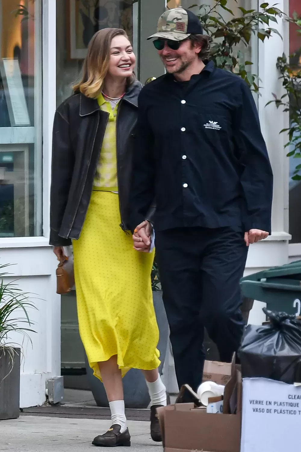 Gigi, 30, looked effortlessly chic in a lemon-yellow checked polo from her own brand, Guest in Residence, paired with an even brighter midi skirt, a black leather jacket, brown loafers, and a charming camel handbag. She finished the look with a beaded necklace and soft, playful waves in her hair.