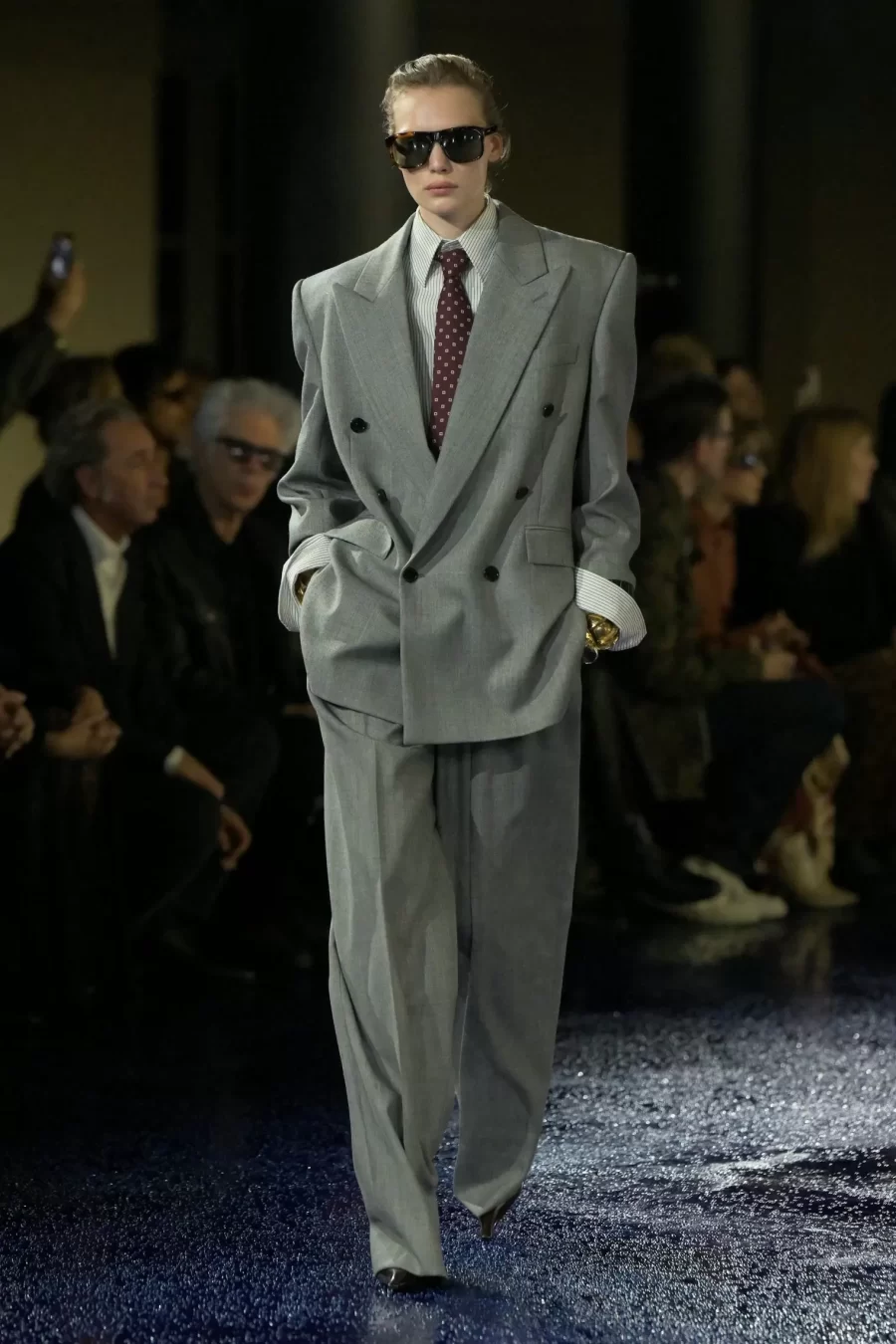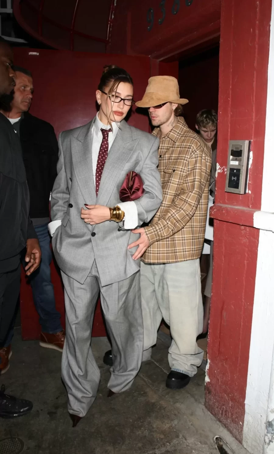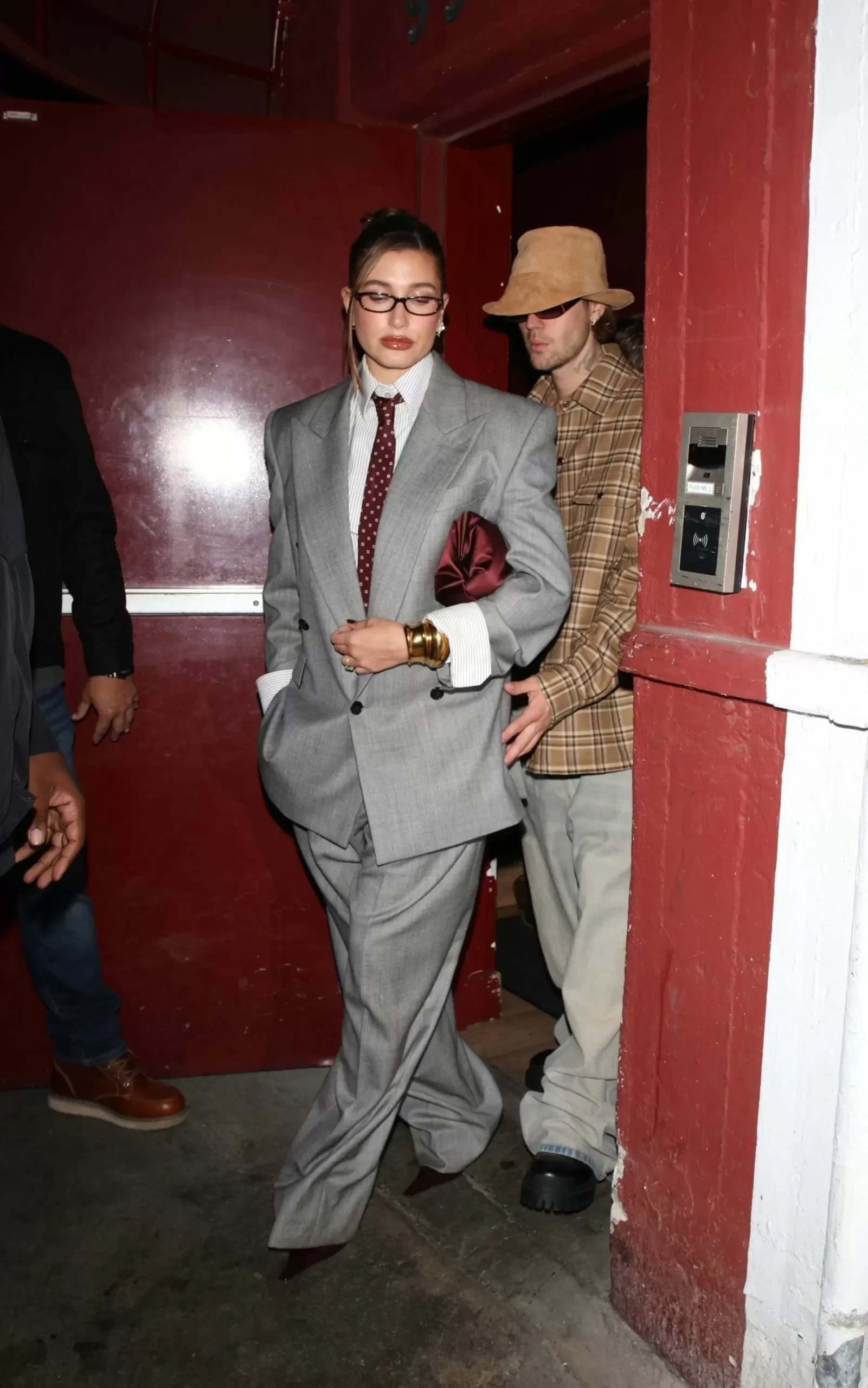 Dressed in a sleek charcoal gray Saint Laurent suit, Hailey sported 1980s shoulder pads that evoked power and dress pants that fell naturally over her stilettos. Complete with a white shirt and an understated red patterned tie, the look borrowed details from a true kingpin’s attire. Her gold accessories and a scarlet clutch added the perfect touch of sophistication.