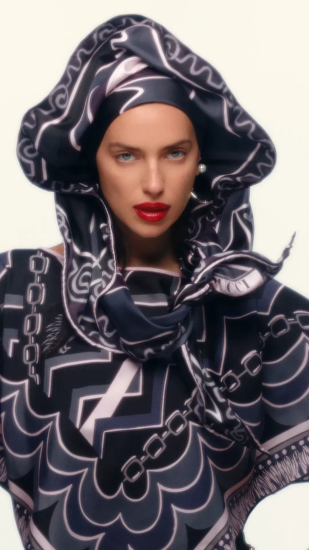 In the campaign, Shayk wears the brand’s signature prints from head to toe, featuring recognisable references such as Marmo, Istrice, Hawaii and Labirinto, reinterpreted through a contemporary lens. For Pucci, these scarves represent far more than an accessory: they are a symbol of identity, a gesture of personal style that has endured for more than seventy-five years without losing relevance. The creative team is rounded out by stylist Jacob K, hair by Ryan Mitchell, and precision make-up by Min Kim, shaping a cohesive and character-rich visual universe.