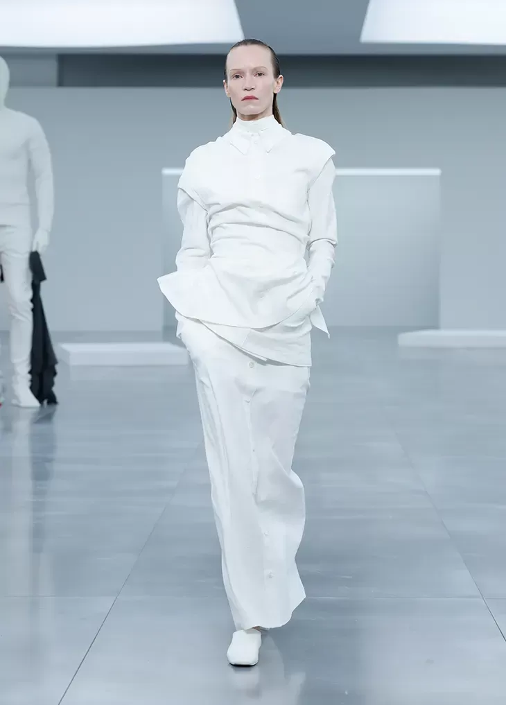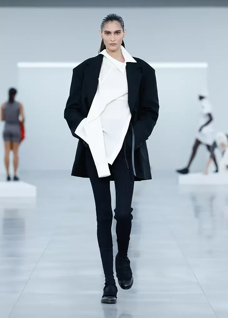 Through four thematic pillars—Abstract Concrete, Body Object, Nature Fabrication, and Clothing Sculpture—the collection explores new ways to express the relationship between fashion, the body, and art. The garments are presented in ways that challenge traditional structures: asymmetric cuts, sleeves used as accessories, and the combination of layers and seemingly discordant materials. This approach transforms the runway into a stage of transformative ambiguity.