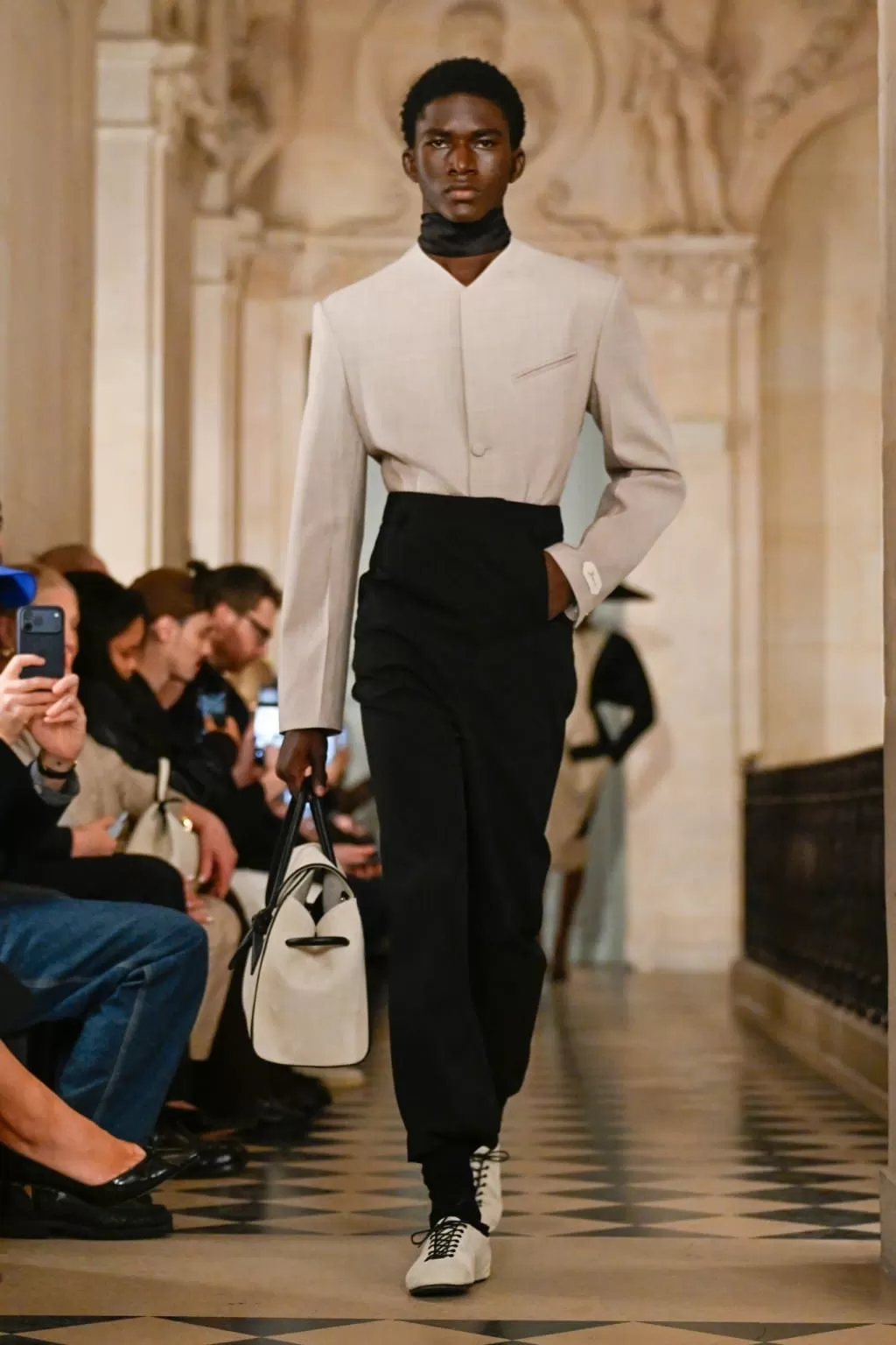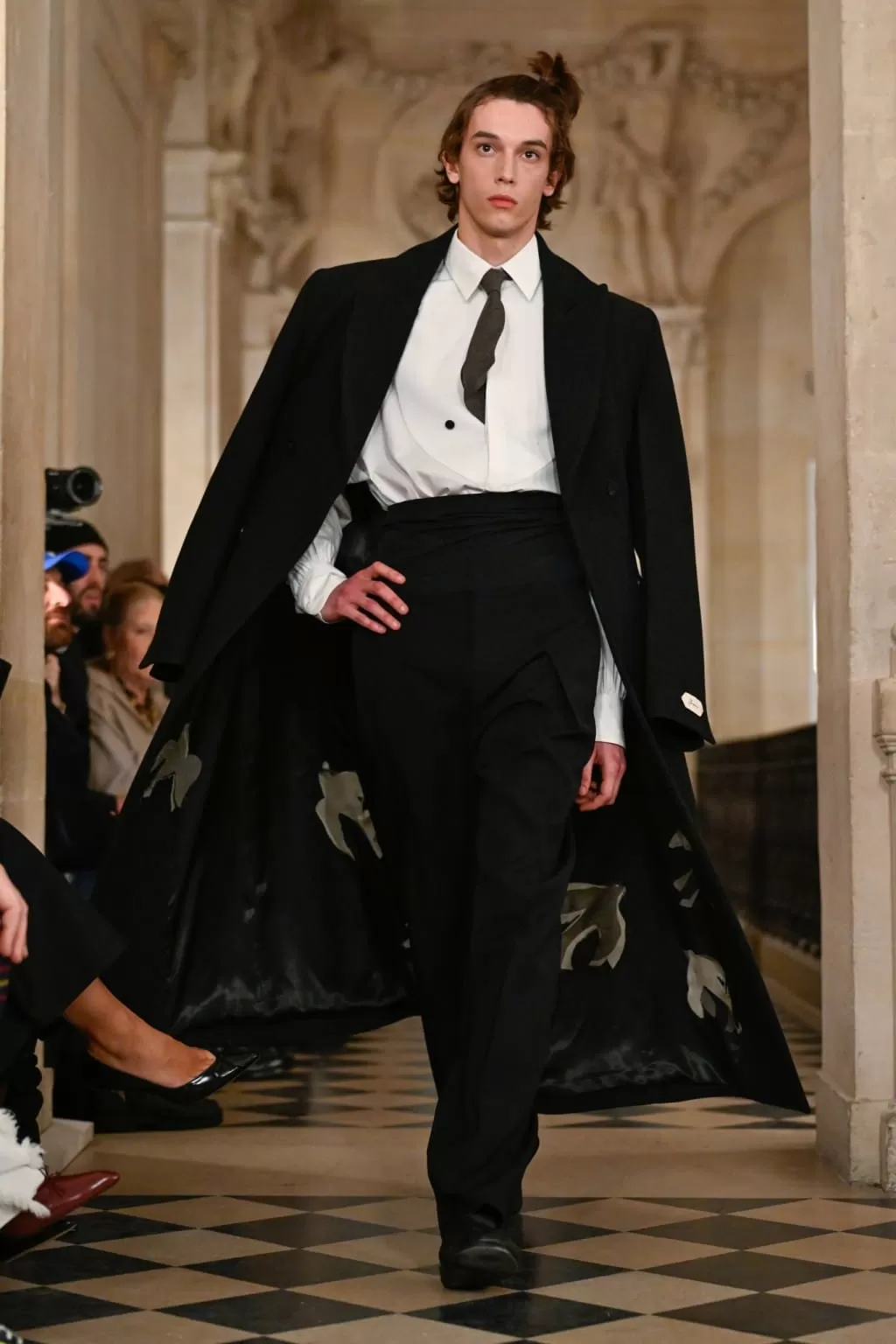 The menswear offering followed a similarly irregular rhythm but delivered some of the show’s freshest moments. Suits in unexpected colours, relaxed reinterpretations of classic tuxedo codes and a distinctly light-hearted attitude defined the line. According to the designer, men’s ready-to-wear now matches women’s in volume within the brand, driven especially by trousers, shirting and tailoring.