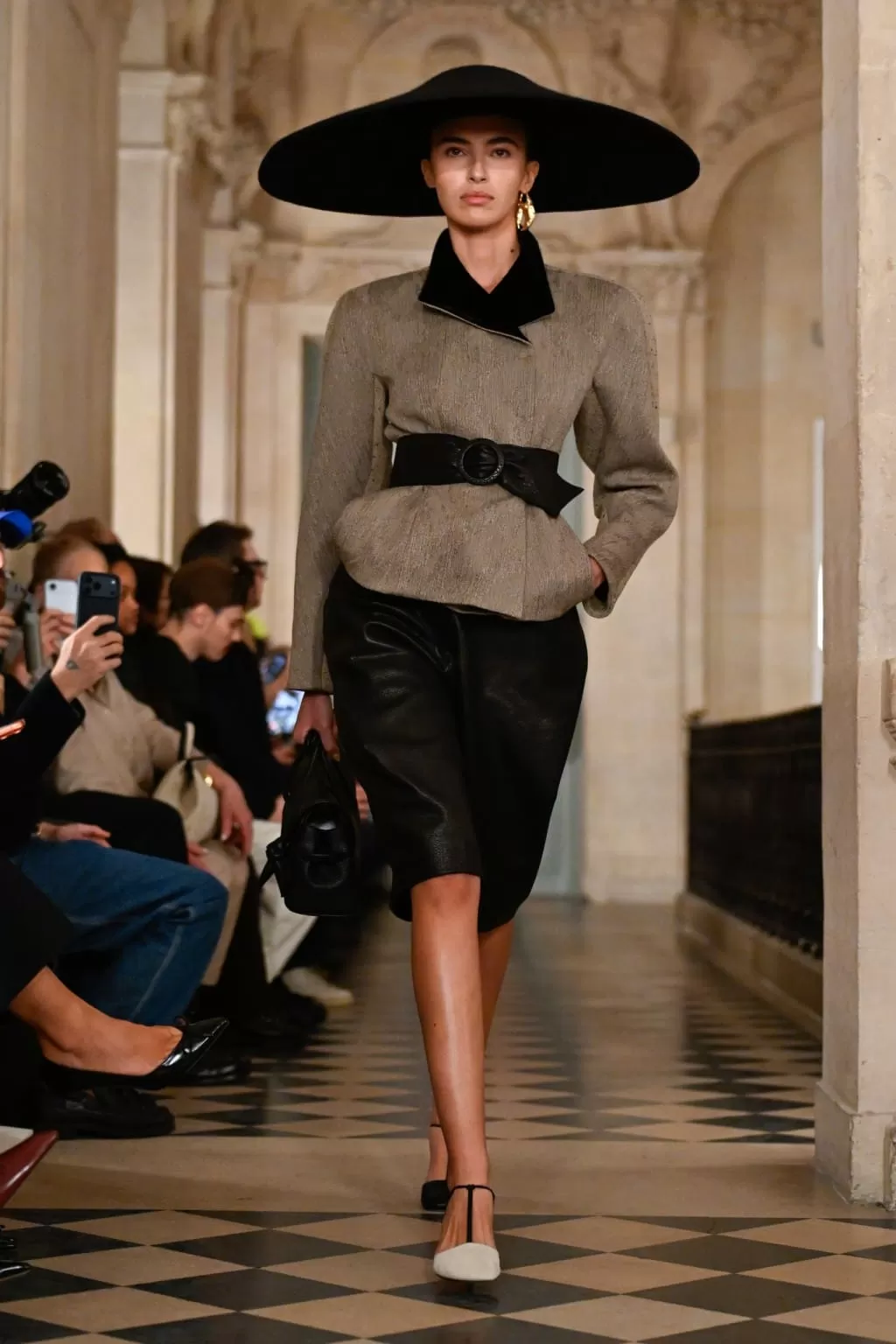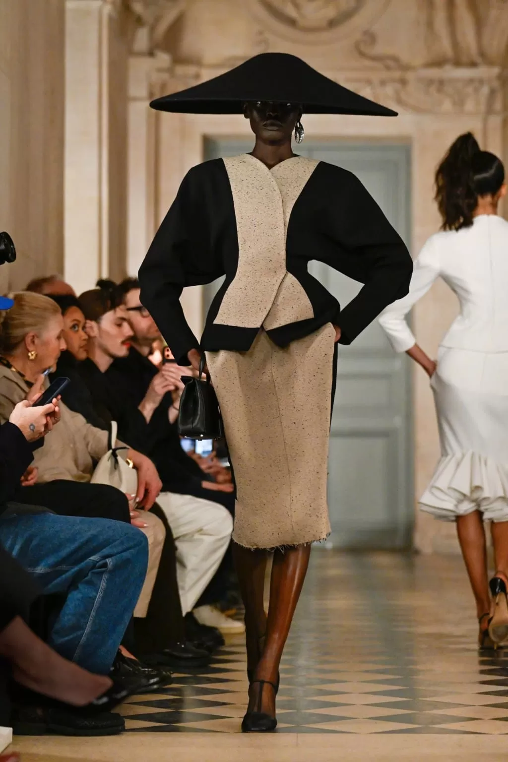 On the runway, many models wore the sculptural hairstyle, reinforcing the retro atmosphere that ran throughout the collection. Feminine silhouettes revolved around cocktail dresses with exaggerated structure, coats with batwing sleeves, elegant daytime suits and pencil skirts hugging the body before erupting into ruffles at the knee. It was an overtly expressive femininity — provocative at times — echoing the golden age of media glamour and unapologetic self-display.