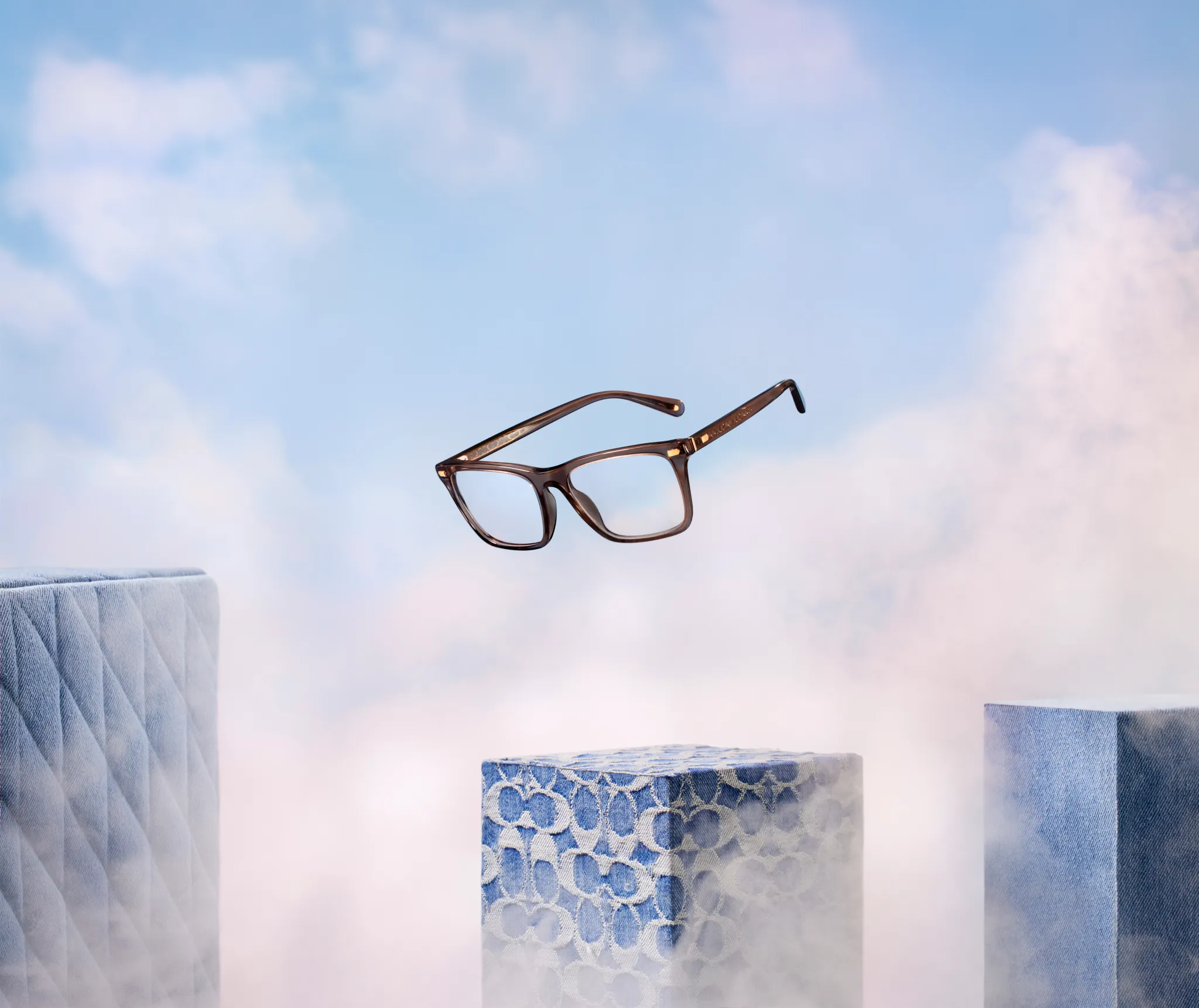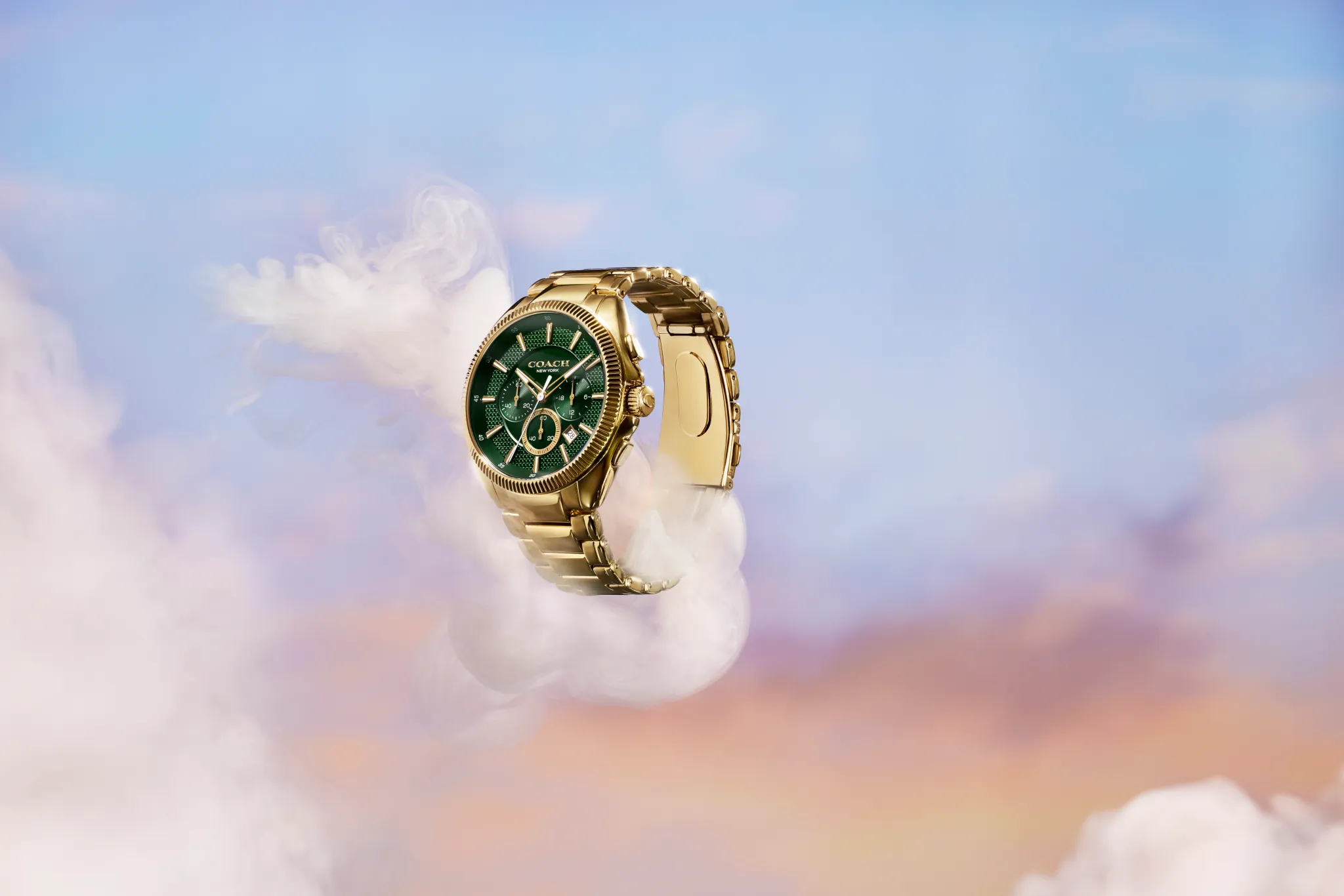 The campaign features Tatum sporting the brand’s “Jackson” watch model, a gold-tone chronograph with a green dial and date window, available in select stores. He also stands out in square sunglasses with keyhole bridge style, featuring Coach’s Signature C pattern in new blue-gray gradient acetates with transparent temples and solid blue-gray lenses.