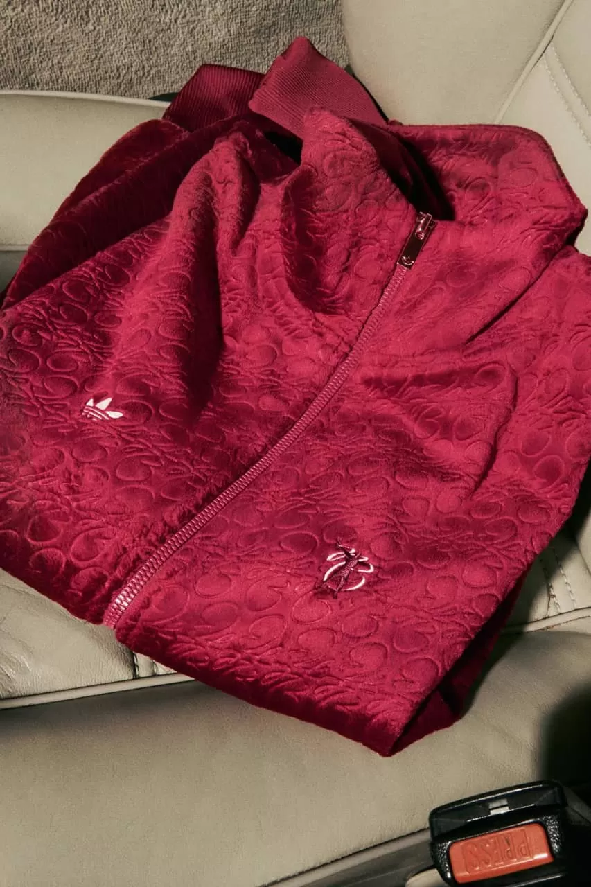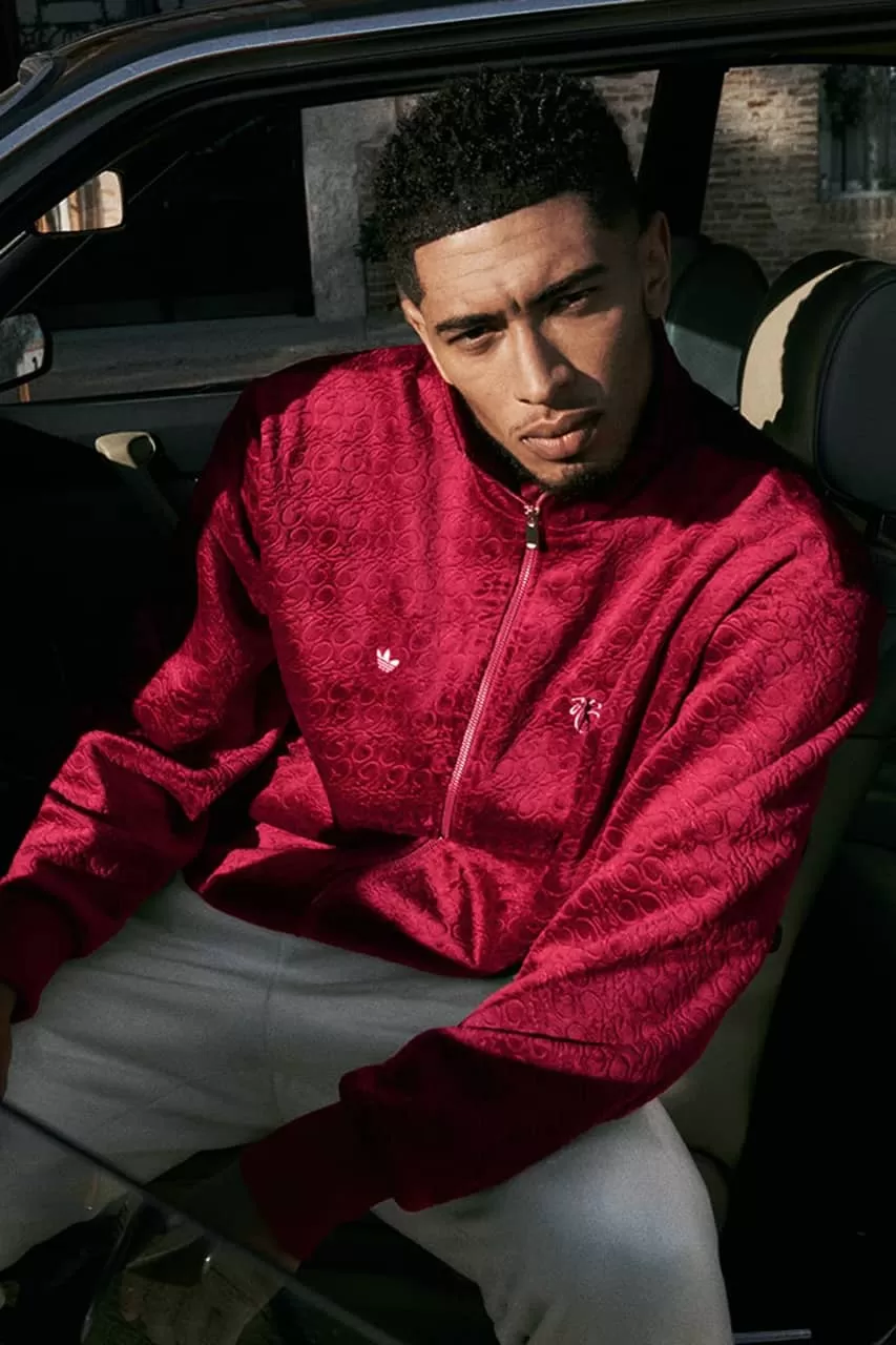 Bellingham is seen sporting a red velour zip-up jacket paired with cream-hued track pants, both featuring adidas’ signature three burgundy stripes. The jacket stands out with its exclusive Jude Bellingham x adidas monogram, the trefoil logo, and the “JB” initials on the chest. In other images, the midfielder wears a burgundy velour polo embroidered with small white logos and mesh shorts with satin accents.
