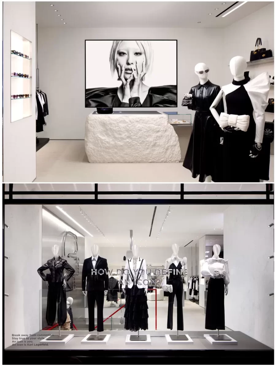 The space also reflects the brand’s commitment to sustainability, using 3D-printed mannequins made from recycled materials. Regent Street hosts the largest variety of collections from the Maison, including prêt-à-porter, accessories, and fragrances. The Autumn-Winter 2024 collection celebrates Karl Lagerfeld’s visionary essence, his chameleon-like genius, and his ever-present innovation.