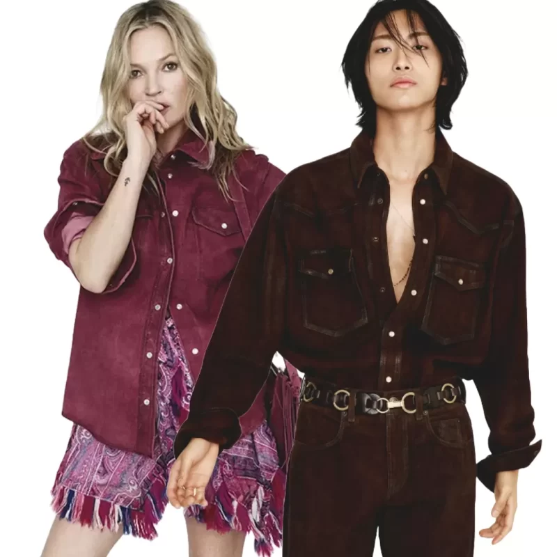 Photographed by Robin Galiegue and styled by Emmanuelle Alt, the campaign unfolds against a minimalist white backdrop, allowing the essence of the garments to shine. Kate Moss, embodying the brand’s signature bohemian and seductive spirit, wears key pieces such as the structured leather jacket and the new Altay bag in black. Alongside her, Seonghwa brings a fresh vibrancy to Marant’s menswear universe, strengthening the dialogue between fashion and the global influence of K-pop.