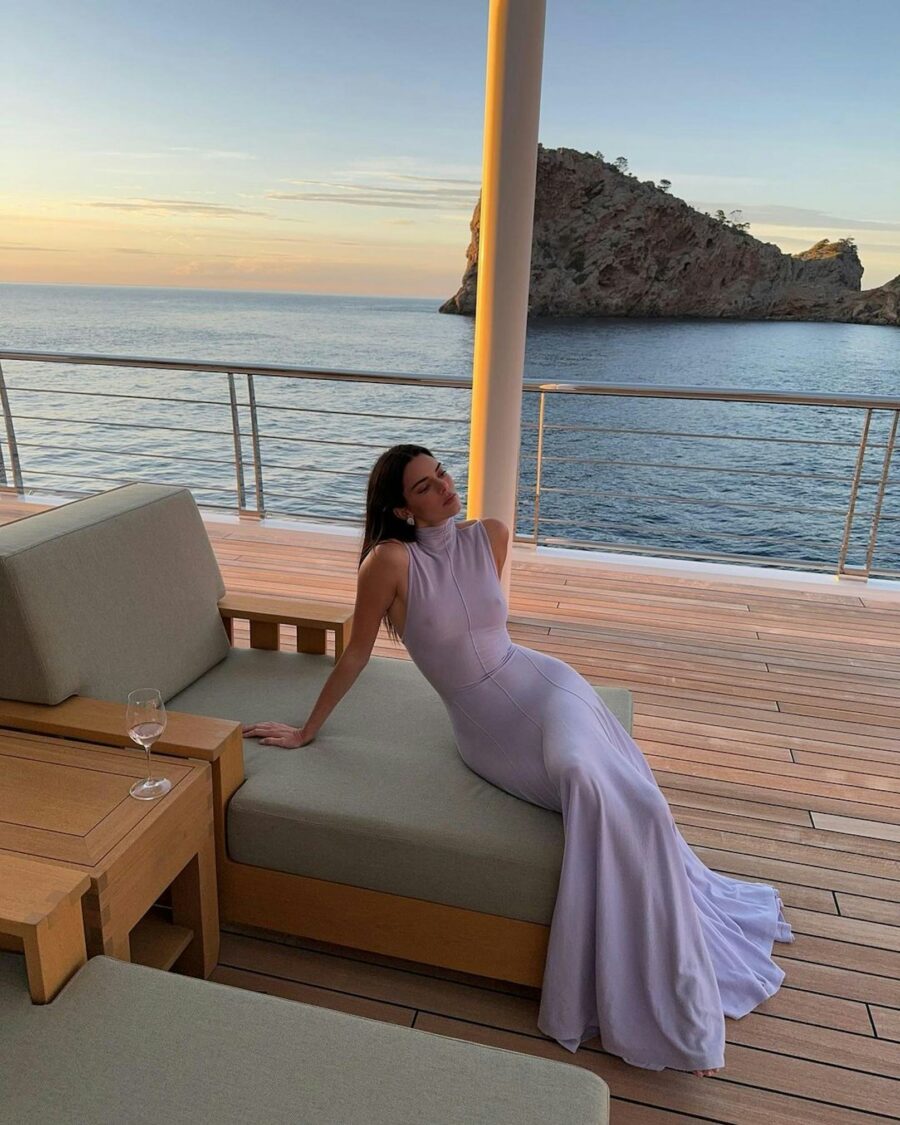 Kendall, who made headlines last week for rekindling her romance with Bad Bunny, wore a lavender dress with a sleeveless bodice and exposed seams at the front. The mermaid-style maxi skirt added a touch of fantasy to the ensemble, complemented by metallic stud earrings and a casual hairstyle. In an Instagram photo, Kendall captioned it “9pm sunsets,” referring to the stunning horizon as the backdrop for her image.