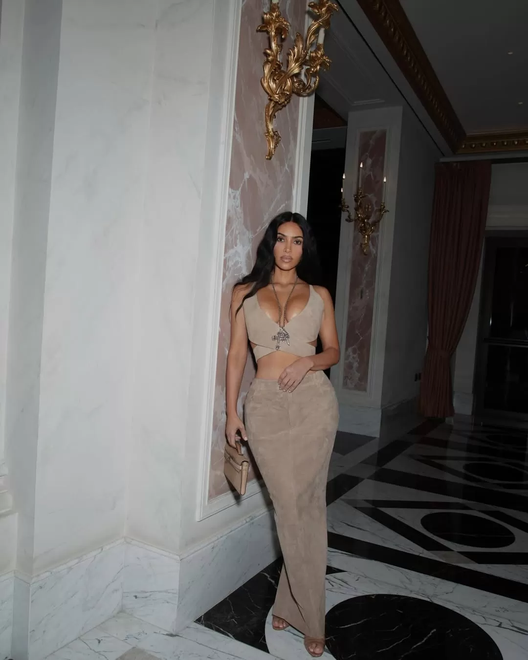 Amid marble halls and hotel corridors, she also wore a camel suede set with an animal print bag, a black dress with a side slit by the sea, and a pair of leggings paired with a crop top in the style of Bianca Censori, the current partner of her ex, Kanye West. As an emotional touch, she posed with her blue-haired daughter North West while enjoying an intimate dinner.