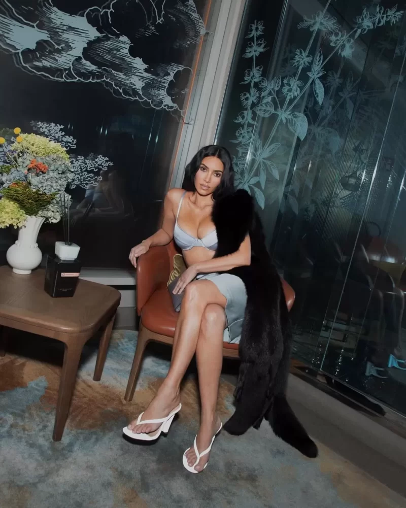 In the first series of photos, Kim appears in a satin Miu Miu ensemble featuring a sky-blue bra, a matching midi skirt, and exposed briefs. She completed the look with white sandals, a crocodile leather handbag, and a fur coat draped over her shoulder—a composition reminiscent of the golden era of 2000s fashion blogging, but reimagined in haute couture style.