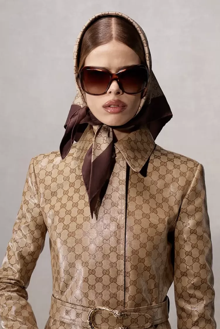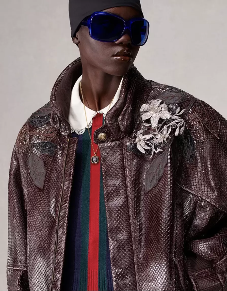 At the same time, Demna engages directly with the Gucci archive. The Gucci Bamboo 1947, the Flora motif and the GG Monogram reappear through updated treatments rather than literal nostalgia. References to past creative eras are embedded in form and styling: sleek, sensual leather recalls Tom Ford’s tenure, while sheer gowns with florals and feathers nod to Alessandro Michele’s theatrical language.