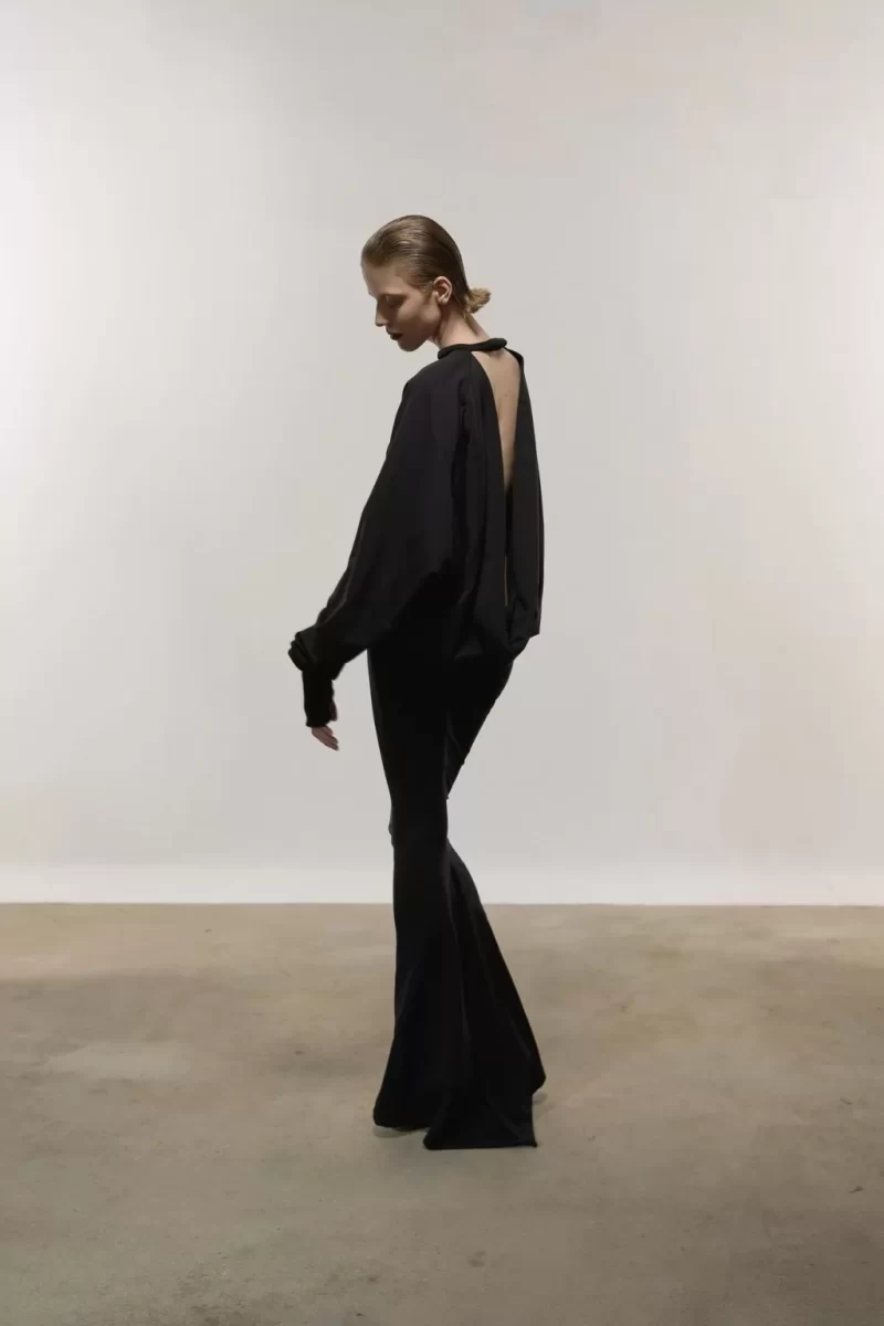 The garments blend craftsmanship with modernity. Laser-engraved embroidered shirts, tailored trousers with tone-on-tone details, and waxed jeans with zippers define her everyday look. For maximum impact, a silk slip dress with a hood and a leather jacket—evoking both a matador’s bolero and a biker’s jacket—stand out.