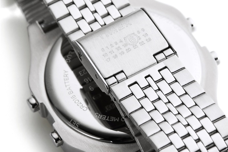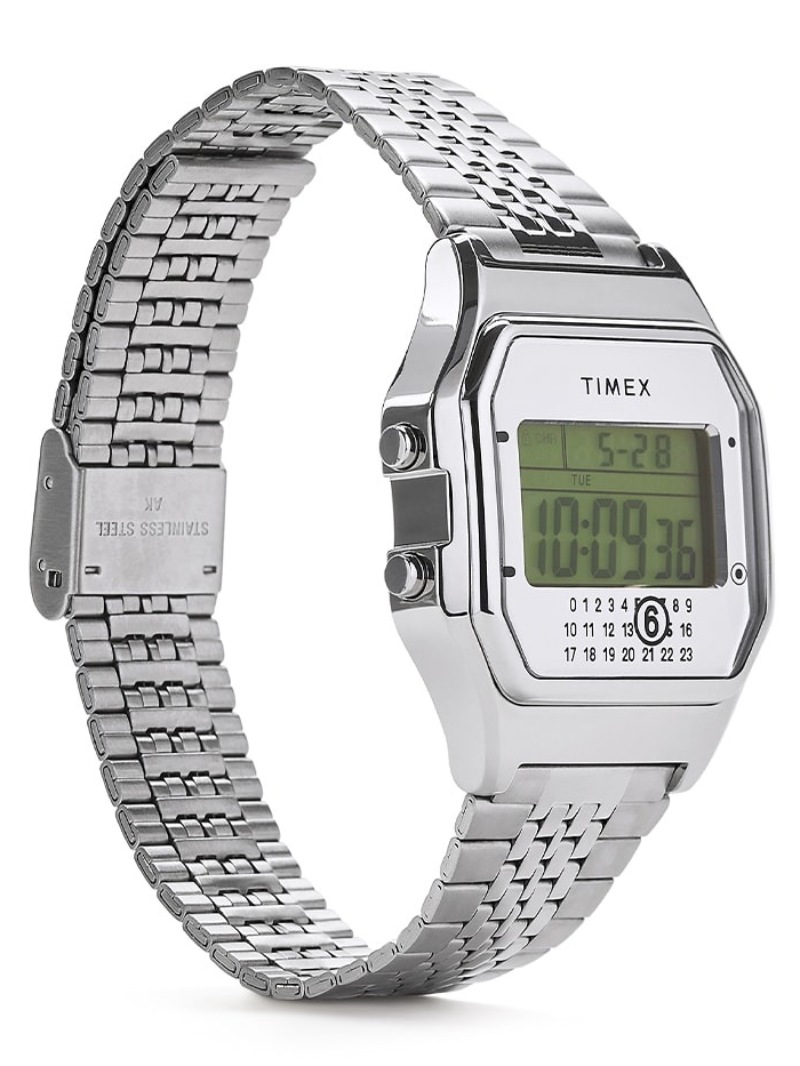 The T80 Gift Set retains the essence of classic Timex design, with a 34 mm stainless steel case and matching bracelet. It includes typical functions such as chronograph, alarm, date, and Indiglo backlight. In addition, it is distinguished by an exclusive detail: a mirrored mask on the dial showing a numerical sequence from 0 to 23, where the number “6” is highlighted as a nod to the MM6 signature. The set also includes an additional bracelet that can be worn alongside the watch or independently, reflecting the duality and versatility characteristic of Margiela’s fashion.