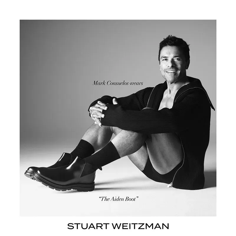 Mark Consuelos debuts as Stuart Weitzman’s first male ambassador, showcasing his style and physique in a campaign that redefines male elegance.