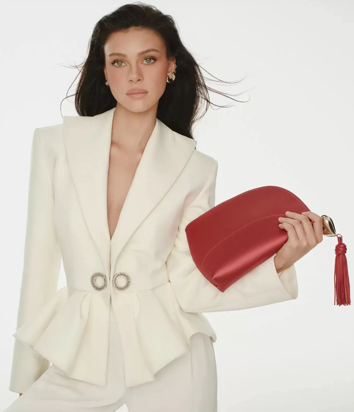 The FW25/26 collection translates this vision into a contemporary key: fringes that evoke feminine power and sensuality in motion, tailored suits in white, red and champagne balancing architectural precision with enveloping silhouettes, and a striking red dress encapsulating the passion and determination of modern femininity. Each piece reaffirms GENNY’s commitment to a refined, self-aware and timeless aesthetic.