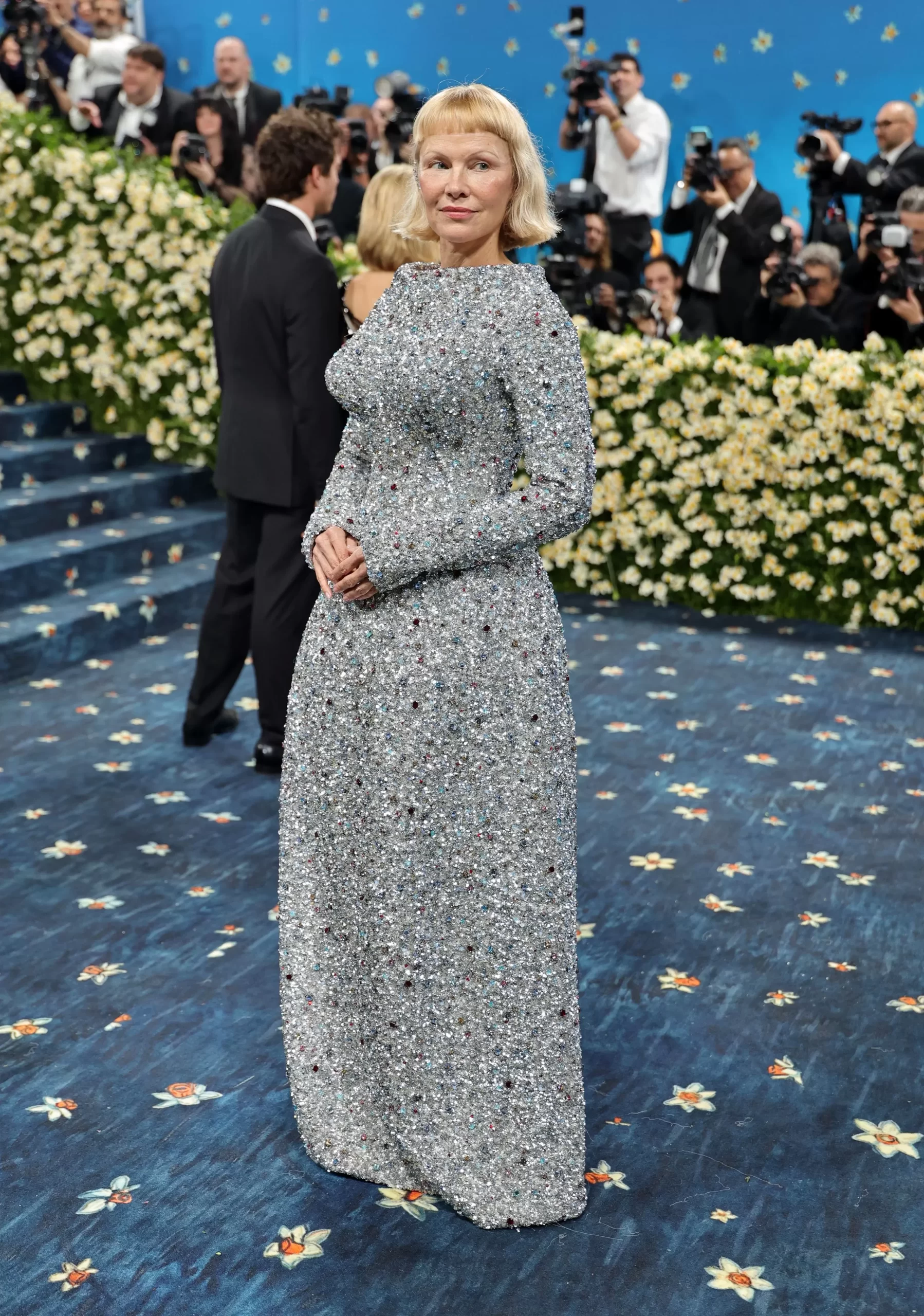 Pamela Anderson, radiant at 57, arrived in a structured Tory Burch gown embellished with blue, red and silver crystals. Though her long-sleeved silhouette gave a subtle nod to the Tailored for You dress code, the truth is that the actress did not engage with either the spirit or cultural roots of the tribute. Her fresh blonde bob with micro fringe and minimalist makeup reaffirmed her elegance—but the deeper message was blurred.