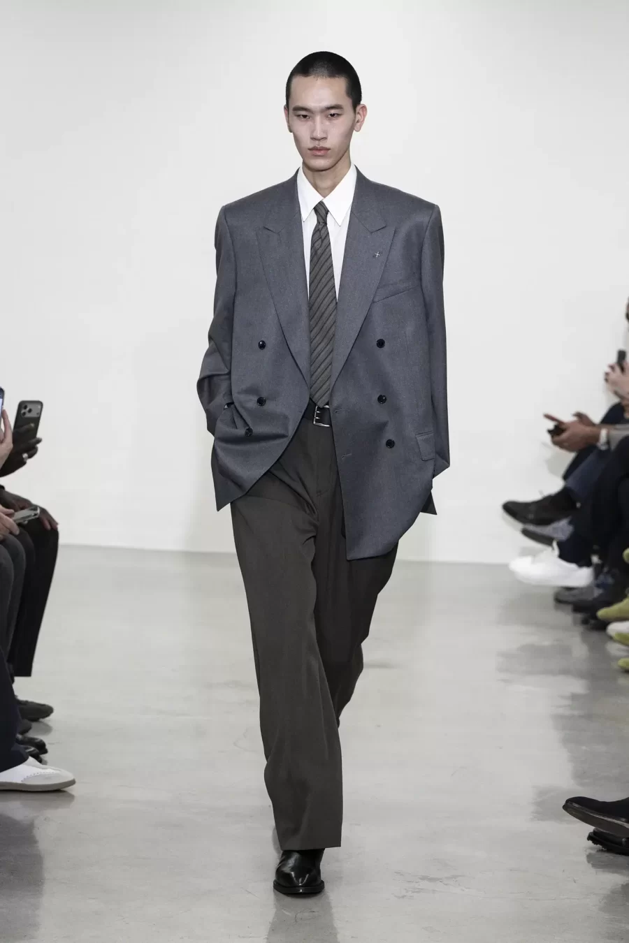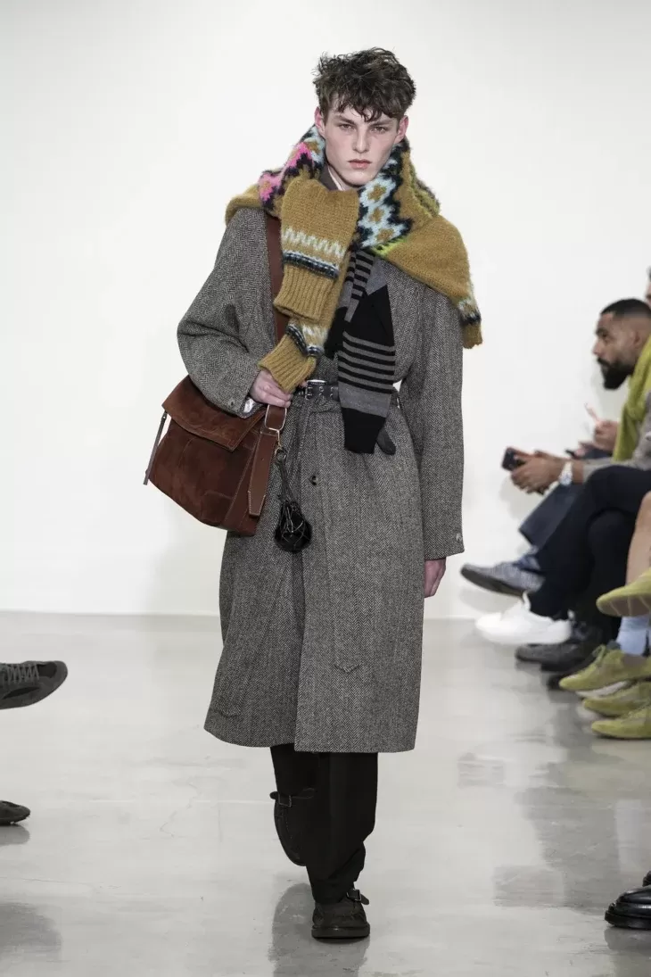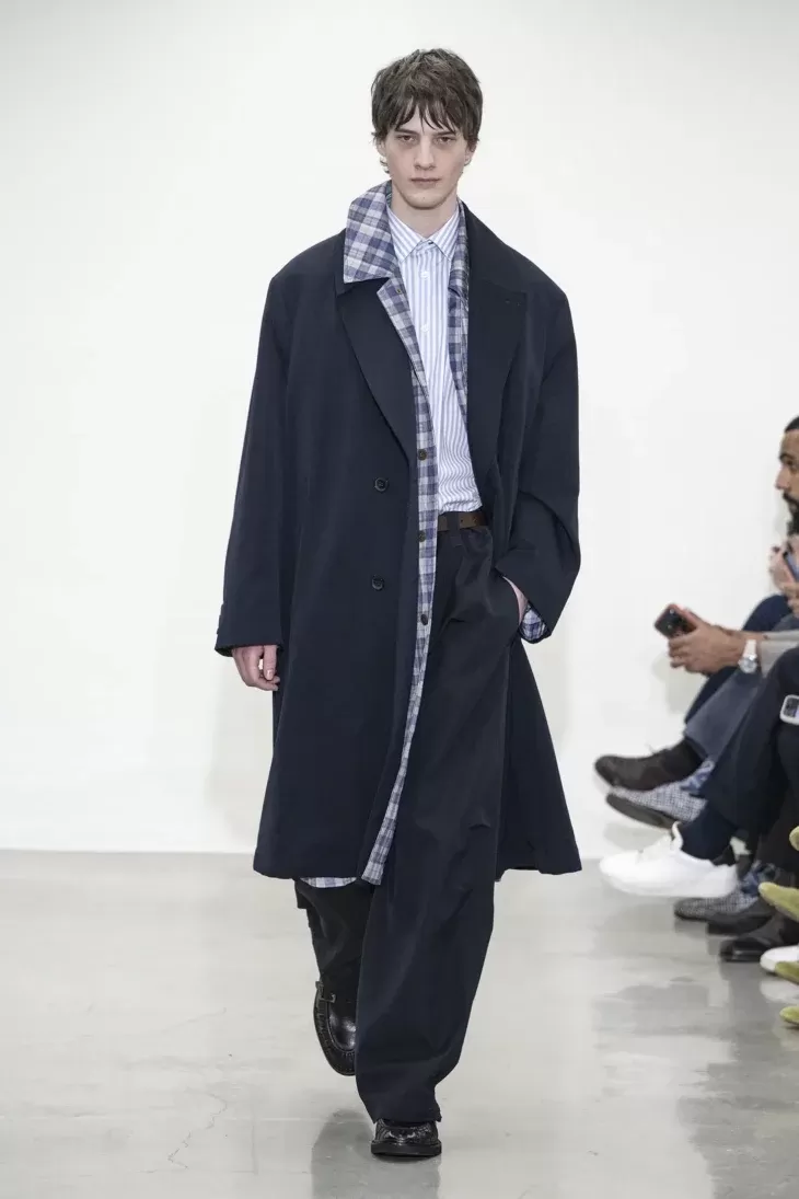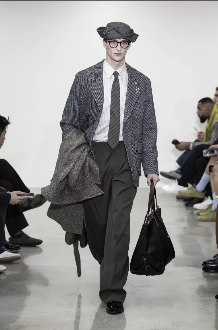 Silhouettes from the late 1980s and early 1990s return refined and liberated from period codes. Jackets are deconstructed, featuring subtle inside-out detailing that reveals the suit’s internal architecture without sacrificing precision or elegance. Technique becomes visual language, while the essence of British tailoring remains intact.