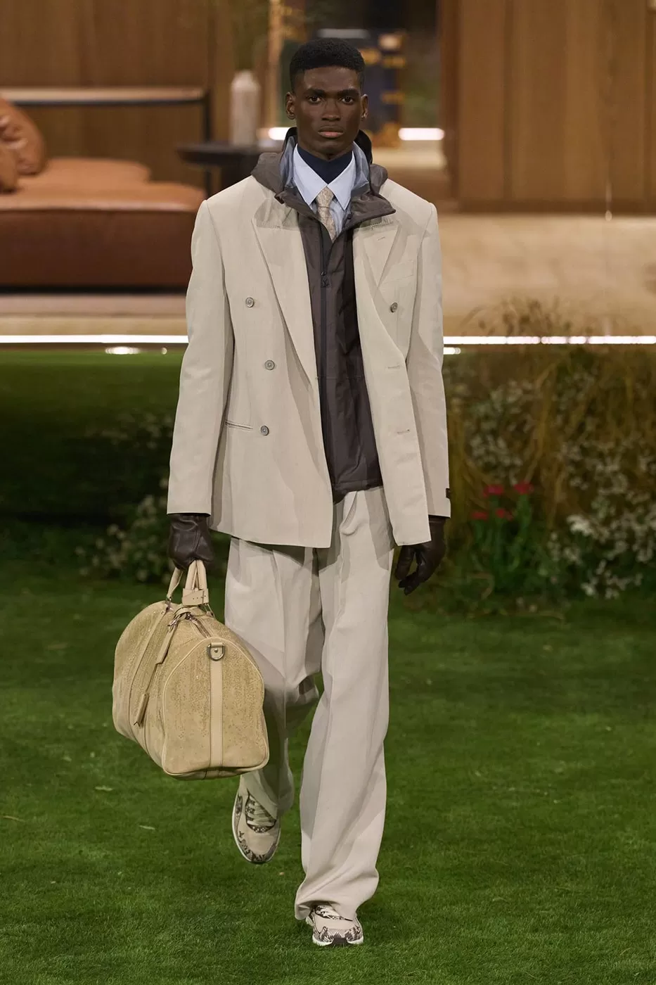 Inside this architectural setting, the collection unfolded with calm authority. Double-breasted suits and leather blazers appeared in earthy, grounded tones—sand, khaki, forest green—eschewing stiffness in favour of ease. Denim stepped back, replaced by sharply cut trousers and elevated outerwear, including statement bomber jackets crafted in crocodile leather. The message was clear: tailoring doesn’t need rigidity to convey strength.