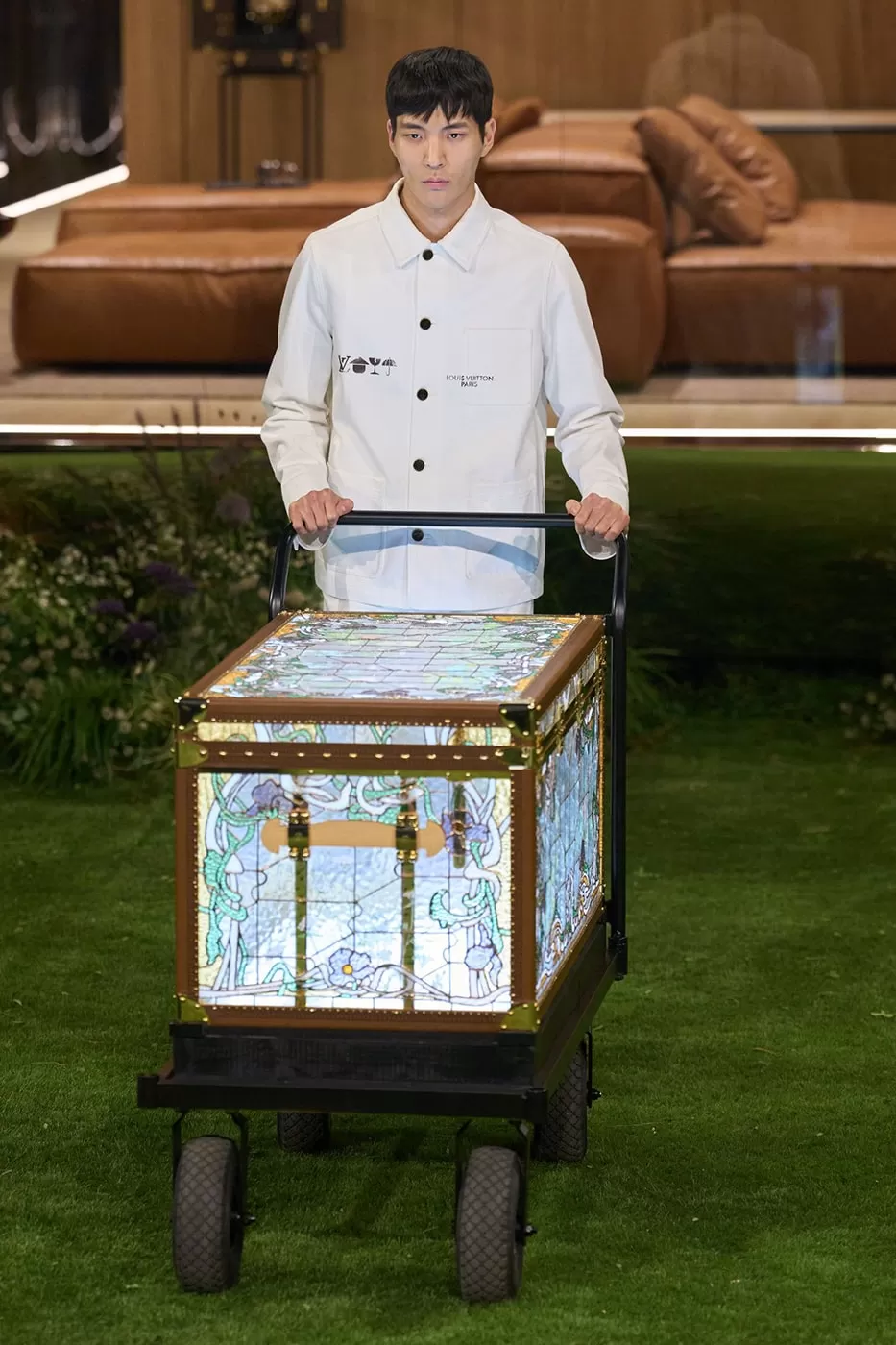 Sound played an equally important role. A bespoke soundtrack of unreleased music—produced internally at Louis Vuitton—featured new material from A$AP Rocky, John Legend and Quavo, alongside a first-ever collaboration between Pharrell and Jackson Wang. Musicians blurred into models, with Pusha T stepping onto the runway, while figures like Callum Turner and Joe Keery anchored the front row.