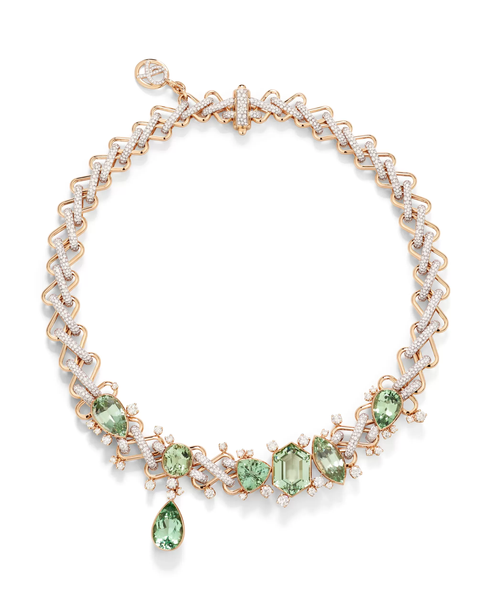 Under the creative direction of Vincenzo Castaldo, pieces such as the Chain Cascade necklaces featuring Ceylon sapphires, or the striking Asimmetrico Tanzanite with its 55.96 carats, reveal a bold and unmistakable approach. The brand also celebrates technique with transformable jewels, mathematically designed chains, and rare gems such as mandarin garnets and green tourmalines.