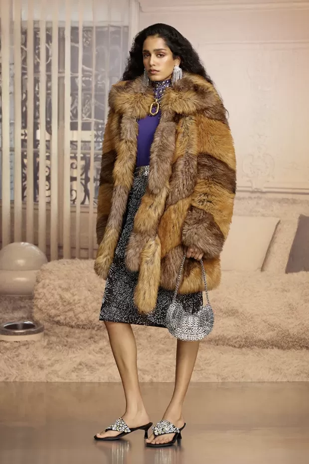 The concept of “Contain and Release” underpins the collection: tailored silhouettes are contrasted with fluid fabrics, while embroidery and experimental materials play with the illusion of layering. The house’s signature chainmail is transformed into aquatic tones and reimagined in dresses that shimmer like reflections of light. Exaggerated outerwear, such as faux fur coats and embossed leather smocks, adds drama without rigidity.