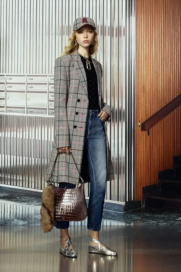 The style of Françoise Hardy is evoked as a free-spirited muse, rather than directly imitated. Versatile pieces like net dresses with translucent discs and denim sets with zips embody this effortless attitude. Accessories enhance the playful language: handbags adorned with oversized jewels, sporty caps, and metallic details that appear suspended in time.