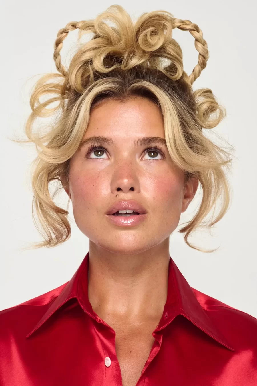 Matilda Djerf, known for her timeless style and influence in the worlds of fashion and beauty, stars in the campaign for the product, showcasing two distinctive looks: her signature voluminous hairstyle and a playful braided updo inspired by the mischievous spirit of the Grinch.