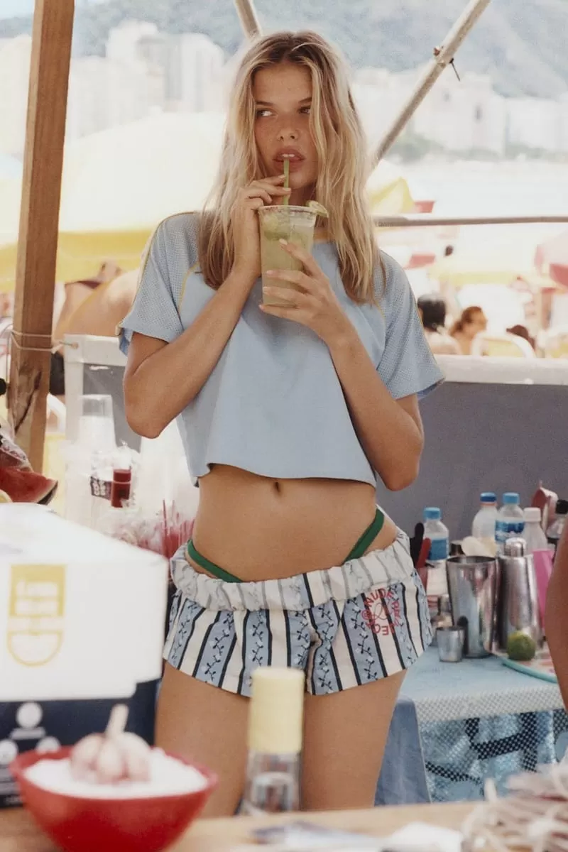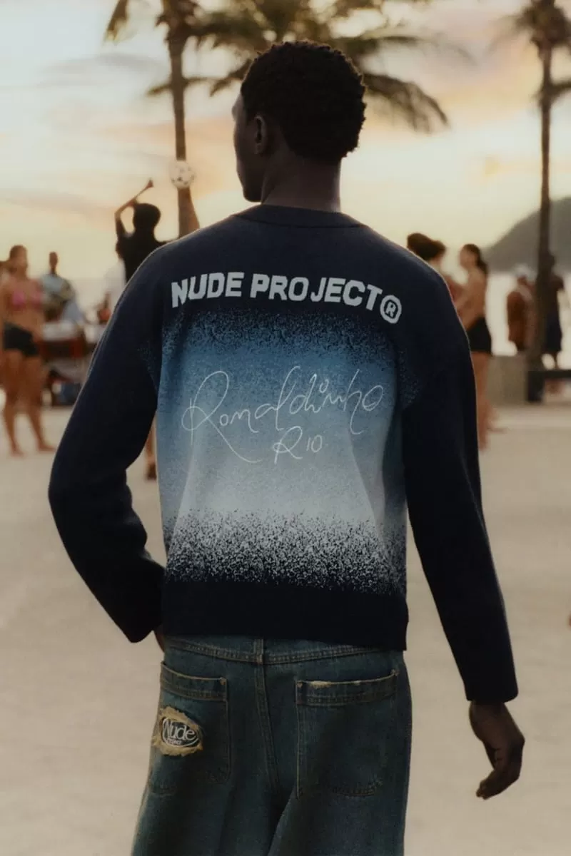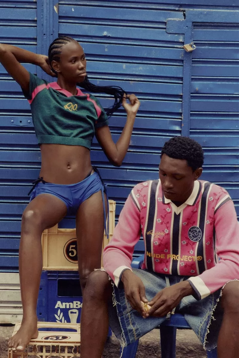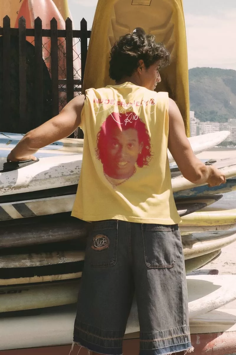 Inspired by the magic of Jogo Bonito, the collection captures the passion, creativity, and joy that defined Ronaldinho’s era. The 30-piece lineup includes knitted football jerseys, T-shirts, jorts, and oversized sweatshirts, all infused with the vibrant energy of Rio de Janeiro. Several pieces feature screen-printed images of the player at different stages of his life, reflecting his journey from a young dreamer to a global star.