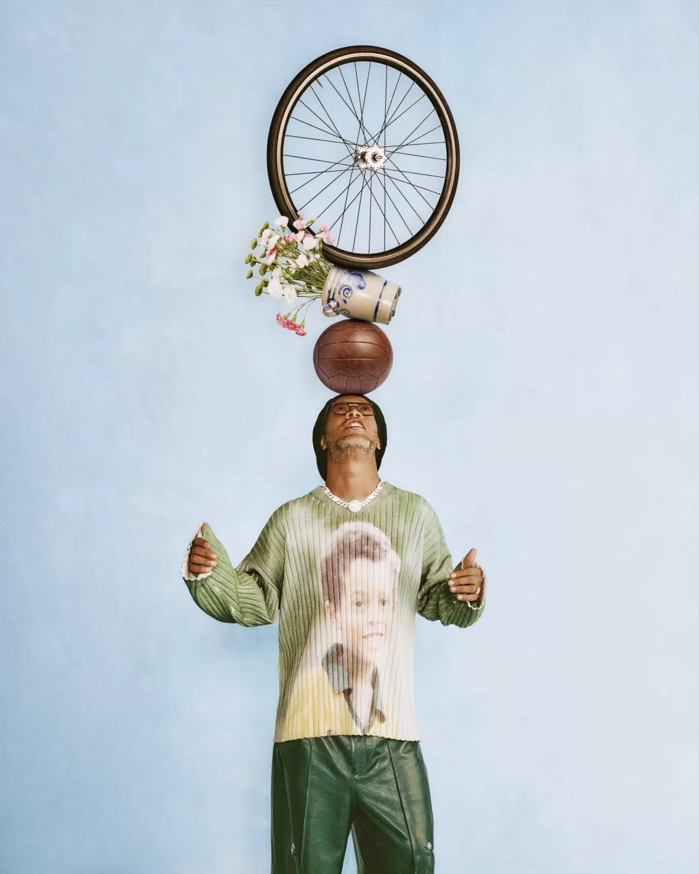 One of the standout pieces is a ribbed jumper showcasing an image of Ronaldinho as a child wearing the Brazil jersey. The colour palette, with washed greens and soft yellow-pink hues, adds a fresh yet nostalgic touch.