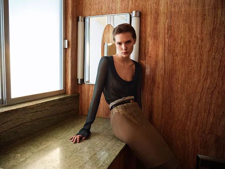 Close-up shots of the models’ legs adorned with sheer stockings and patterns, along with pointed heels, bring a sense of intimacy and subtle sensuality to the campaign. These details, though understated, highlight the brand’s attention to texture and form, turning everyday moments into high-fashion statements.