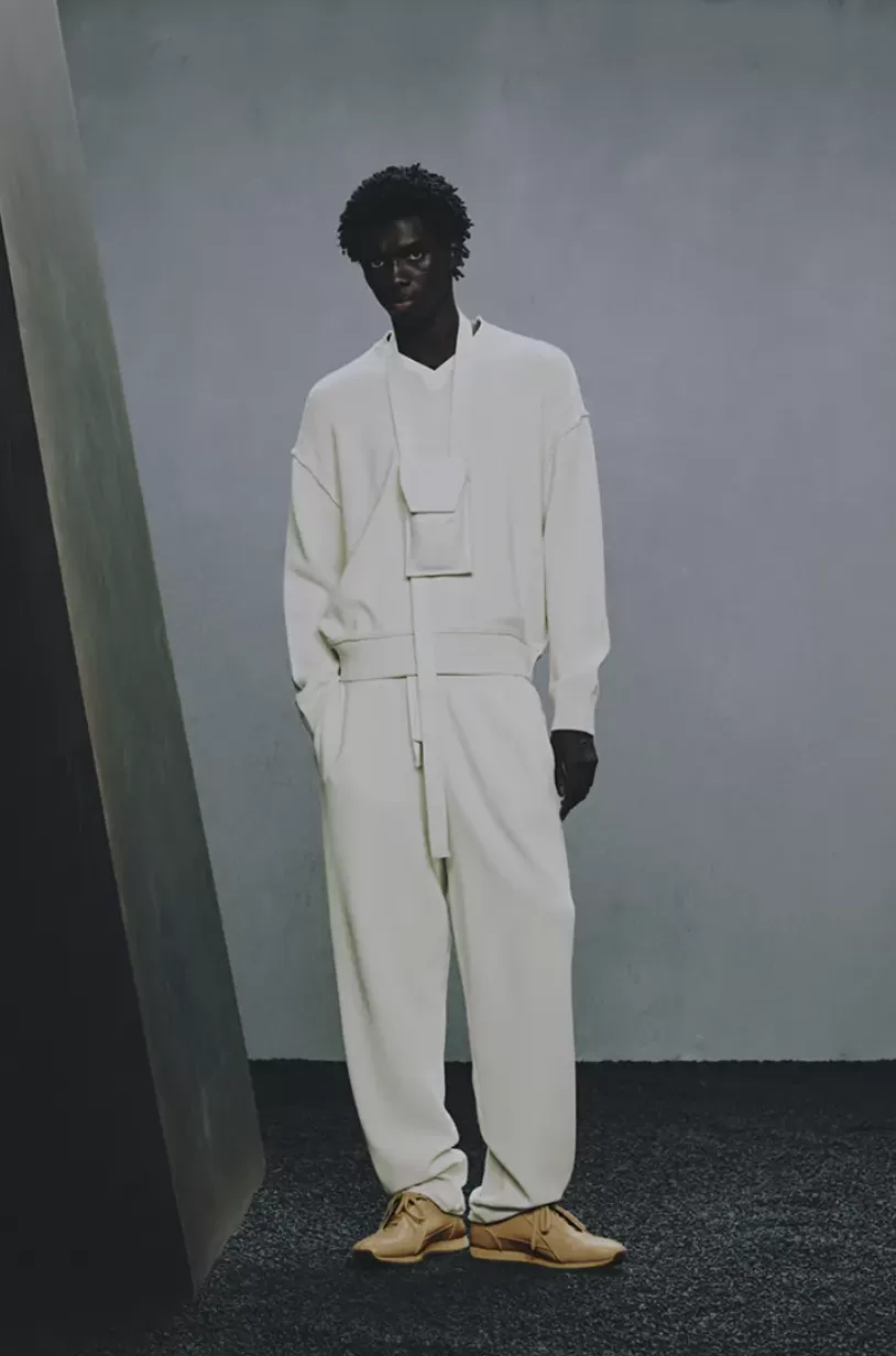 The collection stands out for its minimalist and experimental approach, featuring voluminous outerwear crafted from natural-finish fabrics. Designs such as wrap-around coats, oversized hoods, and faux-fur trapper hats not only provide protection but also serve as bold aesthetic statements. Ross describes these pieces as “equipment for a pan-cultural protagonist,” designed for 21st-century individuals seeking a balance between functionality and style.