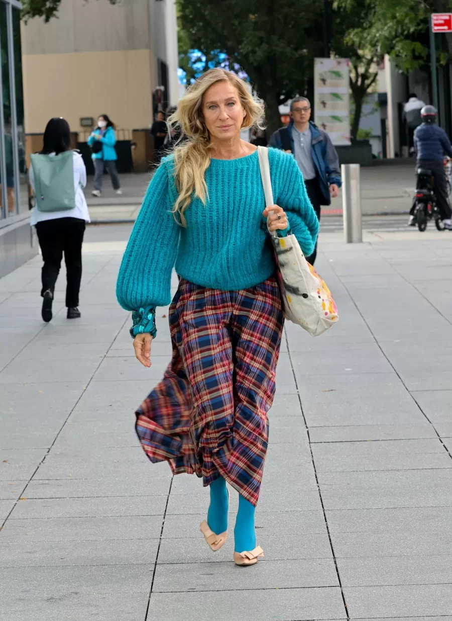 During recent filming, Parker surprised everyone with an outfit that included a teal knitted sweater, a multicolored plaid skirt, and matching tights, all topped off with ivory heels adorned with bows. This nostalgic look, which combines bold patterns and unusual layering, is a clear nod to Carrie’s carefree and original style.