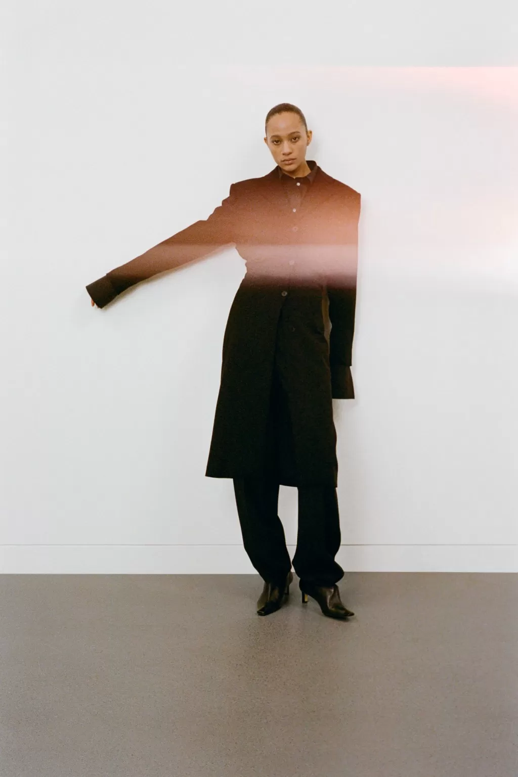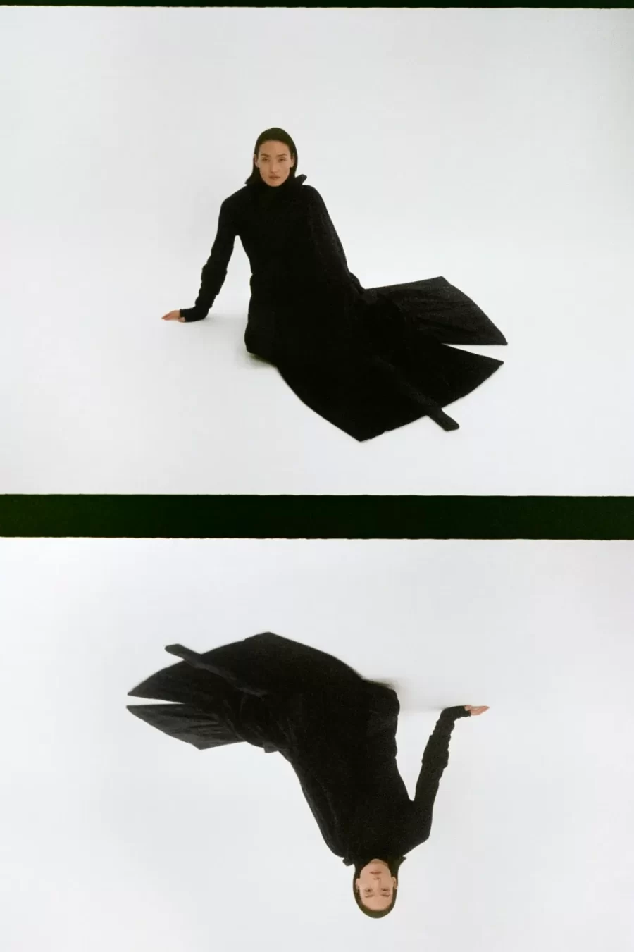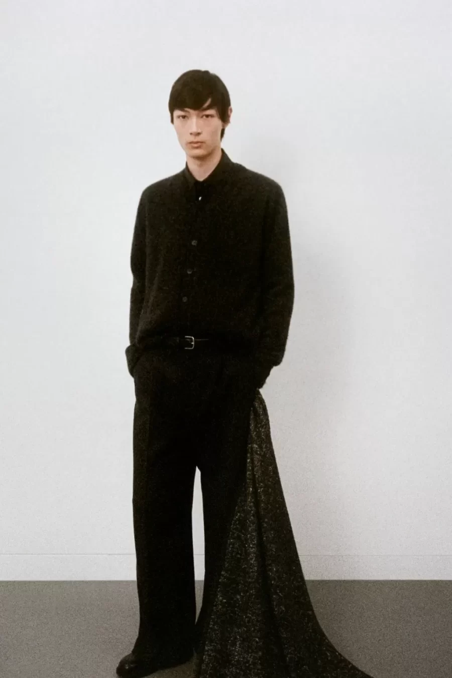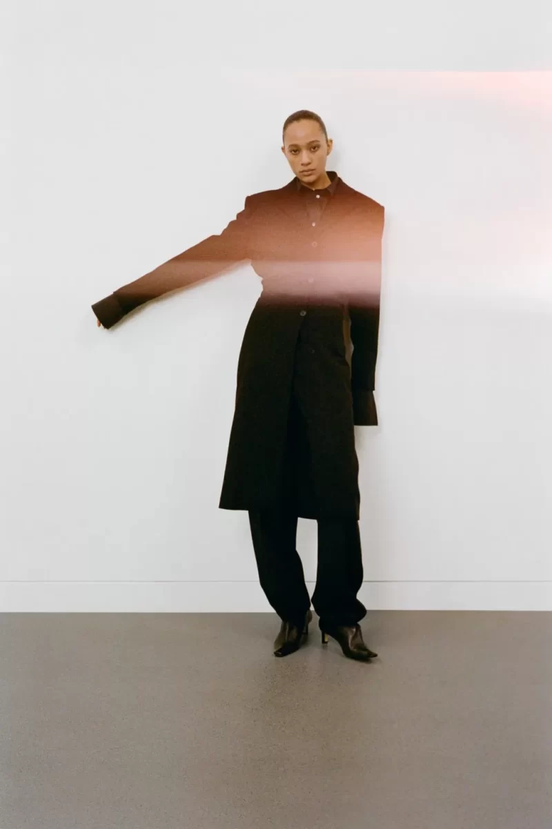 The collection also plays with the idea of building from within, with pieces that seem designed to be worn inside out—such as a cashmere coat with an exposed lining that drapes into a sophisticated outer layer. The interplay of masculine and feminine elements remains present, with pieces like an inverted shirt featuring a back opening and a minimalist jersey dress that evokes the ’90s aesthetic.